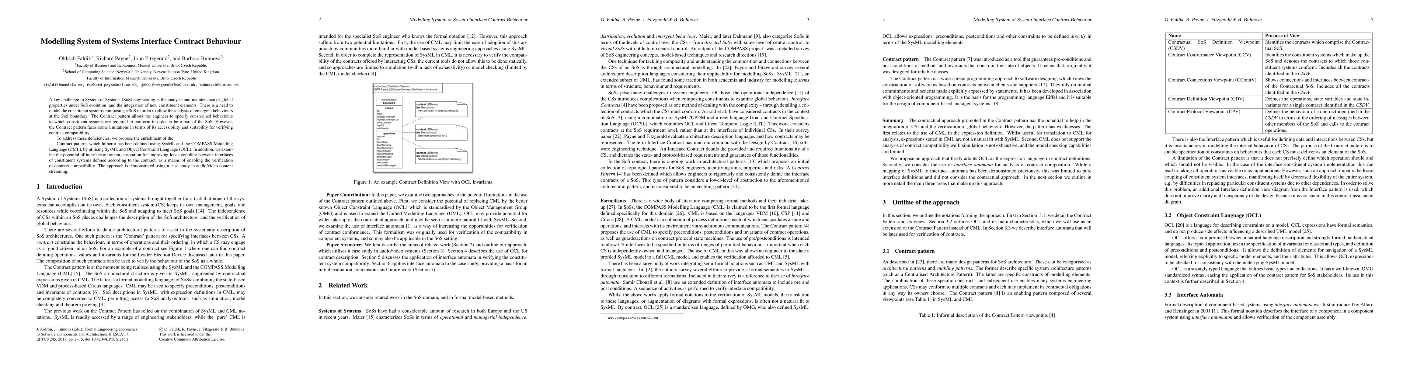 A key challenge in System of Systems (SoS) engineering is the analysis and maintenance of global properties under SoS evolution, and the integration of new constituent elements. There is a need to model the constituent systems composing a SoS in order to allow the analysis of emergent behaviours at the SoS boundary. The Contract pattern allows the engineer to specify constrained behaviours to which constituent systems are required to conform in order to be a part of the SoS. However, the Contract pattern faces some limitations in terms of its accessibility and suitability for verifying contract compatibility. To address these deficiencies, we propose the enrichment of the Contract pattern, which hitherto has been defined using SysML and the COMPASS Modelling Language (CML), by utilising SysML and Object Constraint Language (OCL). In addition, we examine the potential of interface automata, a notation for improving loose coupling between interfaces of constituent systems defined according to the contract, as a means of enabling the verification of contract compatibility. The approach is demonstrated using a case study in audio/video content streaming.