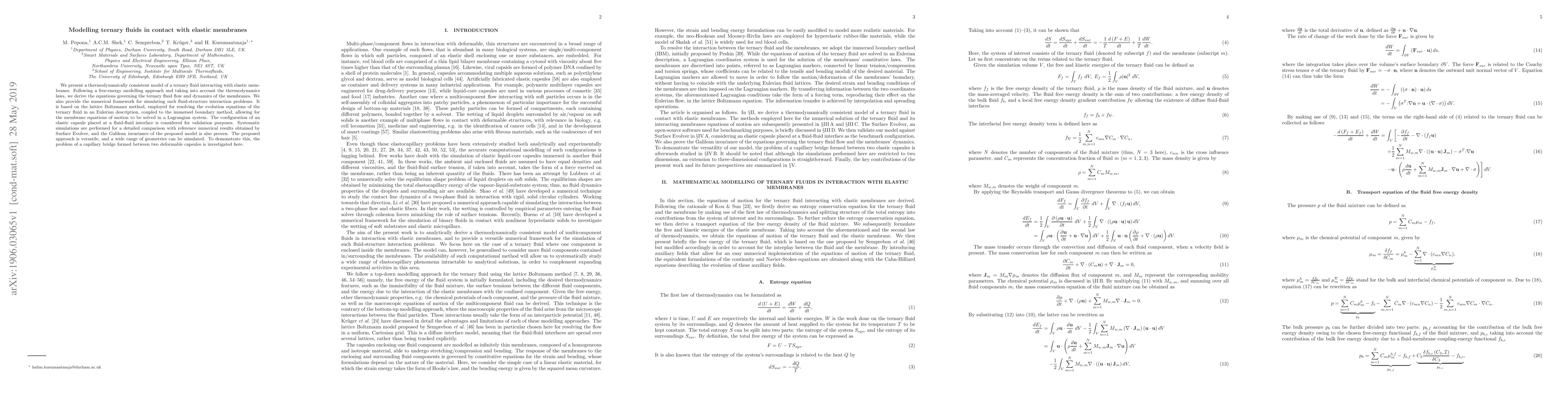We present a thermodynamically consistent model of a ternary fluid interacting with elastic membranes. Following a free-energy modelling approach and taking into account the thermodynamics laws, we derive the equations governing the ternary fluid flow and dynamics of the membranes. We also provide the numerical framework for simulating such fluid-structure interaction problems. It is based on the lattice Boltzmann method, employed for resolving the evolution equations of the ternary fluid in an Eulerian description, coupled to the immersed boundary method, allowing for the membrane equations of motion to be solved in a Lagrangian system. The configuration of an elastic capsule placed at a fluid-fluid interface is considered for validation purposes. Systematic simulations are performed for a detailed comparison with reference numerical results obtained by Surface Evolver, and the Galilean invariance of the proposed model is also proven. The proposed approach is versatile, and a wide range of geometries can be simulated. To demonstrate this, the problem of a capillary bridge formed between two deformable capsules is investigated here.
