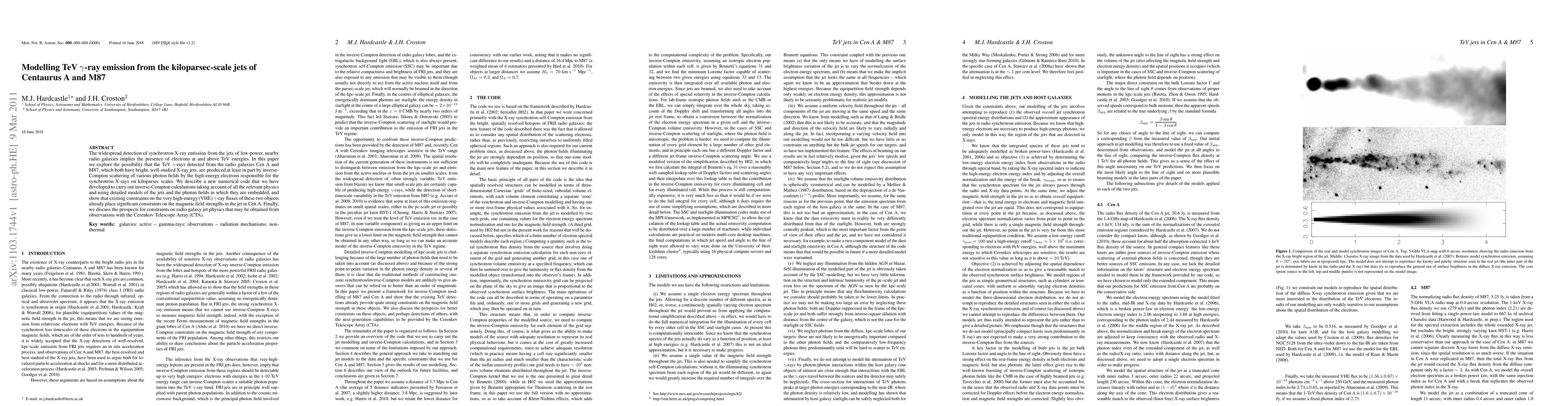 The widespread detection of synchrotron X-ray emission from the jets of low-power, nearby radio galaxies implies the presence of electrons at and above TeV energies. In this paper we explore the possibility that the TeV gamma-rays detected from the radio galaxies Cen A and M87, which both have bright, well-studied X-ray jets, are produced at least in part by inverse-Compton scattering of various photon fields by the high-energy electrons responsible for the synchrotron X-rays on kiloparsec scales. We describe a new numerical code that we have developed to carry out inverse-Compton calculations taking account of all the relevant physics and using detailed models of the jets and the photon fields in which they are embedded, and show that existing constraints on the very high-energy (VHE) gamma-ray fluxes of these two objects already place significant constraints on the magnetic field strengths in the jet in Cen A. Finally, we discuss the prospects for constraints on radio galaxy jet physics that may be obtained from observations with the Cerenkov Telescope Array (CTA).