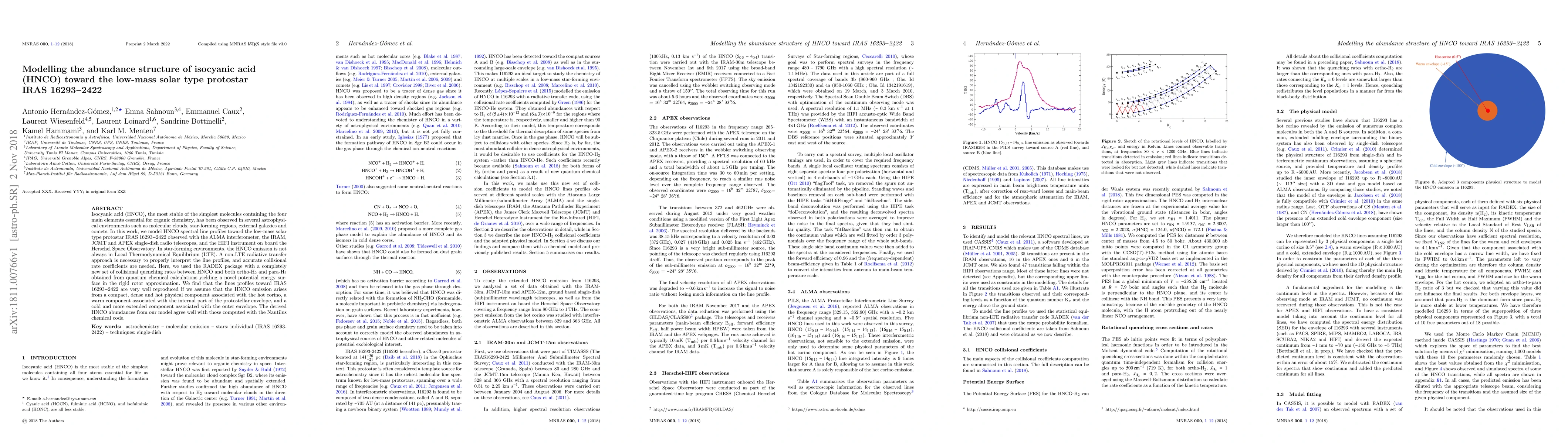 This study models the spectral line profiles of isocyanic acid (HNCO) toward the low-mass protostar IRAS 16293-2422 using non-LTE radiative transfer and new collisional rate coefficients. The results show that HNCO emission arises from a compact hot component, a warm internal component, and a cold outer envelope.