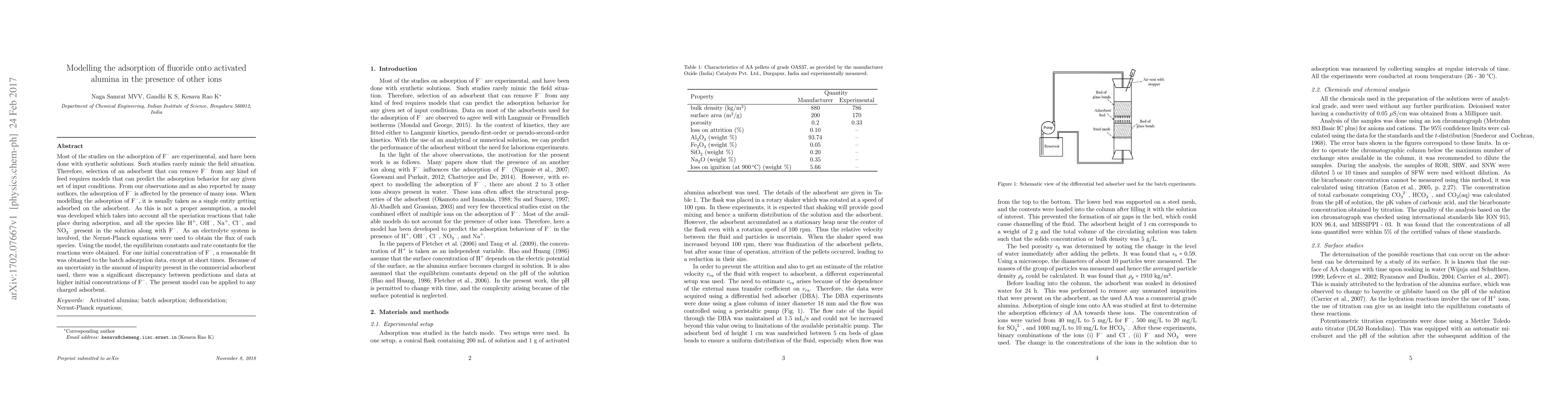Most of the studies on the adsorption of F$^-$ are experimental, and have been done with synthetic solutions. Such studies rarely mimic the field situation. Therefore, selection of an adsorbent that can remove F$^-$ from any kind of feed requires models that can predict the adsorption behavior for any given set of input conditions. From our observations and as also reported by many authors, the adsorption of F$^-$ is affected by the presence of many ions. When modelling the adsorption of F$^-$, it is usually taken as a single entity getting adsorbed on the adsorbent. As this is not a proper assumption, a model was developed which takes into account all the speciation reactions that take place during adsorption, and all the species like H$^+$, OH$^-$, Na$^+$, Cl$^-$, and NO$_3^-$ present in the solution along with F$^-$. As an electrolyte system is involved, the Nernst-Planck equations were used to obtain the flux of each species. Using the model, the equilibrium constants and rate constants for the reactions were obtained. For one initial concentration of F$^-$, a reasonable fit was obtained to the batch adsorption data, except at short times. Because of an uncertainty in the amount of impurity present in the commercial adsorbent used, there was a significant discrepancy between predictions and data at higher initial concentrations of F$^-$. The present model can be applied to any charged adsorbent.