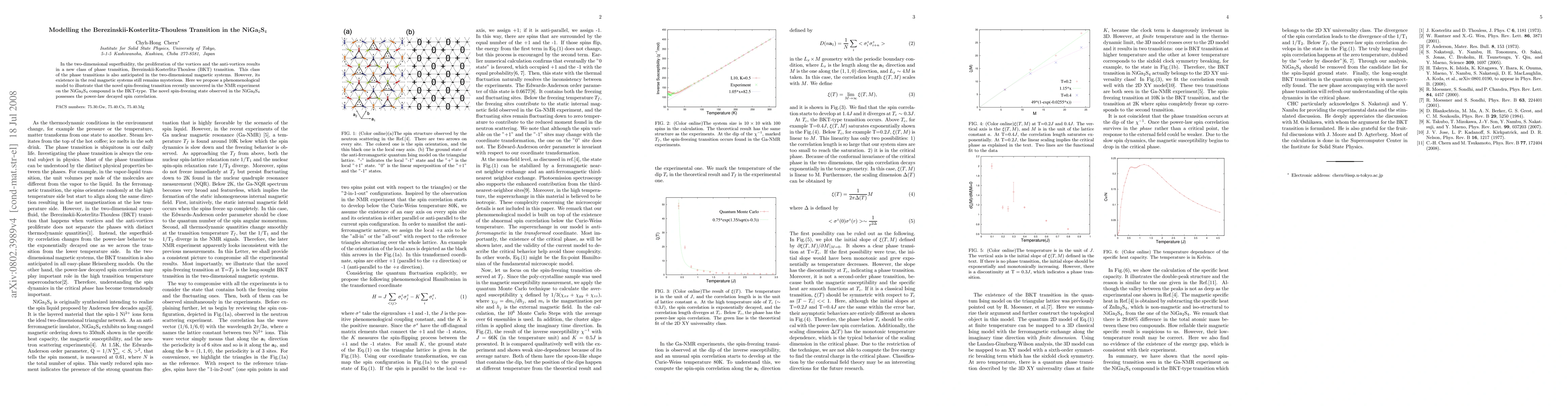 This research proposes a phenomenological model to demonstrate that the novel spin-freezing transition in NiGa_2S_4, observed via NMR, is a Berezinskii-Kosterlitz-Thouless (BKT) transition, characterized by power-law decayed spin correlation. The study aims to clarify the mysterious existence of BKT transitions in real magnetic systems.