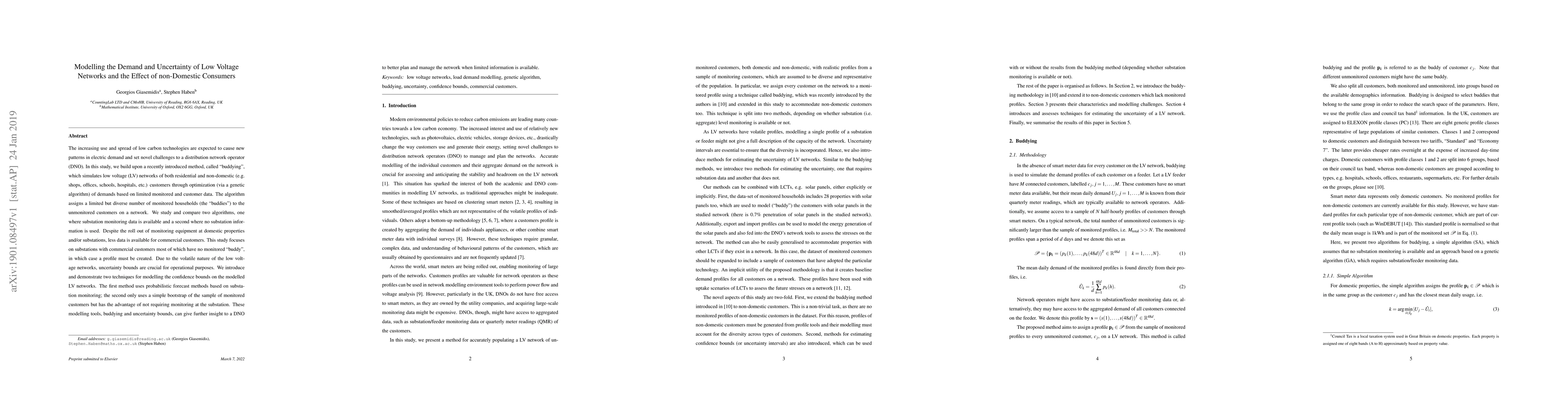 This paper develops a "buddying" method to simulate low voltage networks' demand patterns, incorporating both residential and non-domestic consumers using optimization. It introduces two techniques for modelling uncertainty in these networks, aiming to assist distribution network operators in planning and management despite limited data.