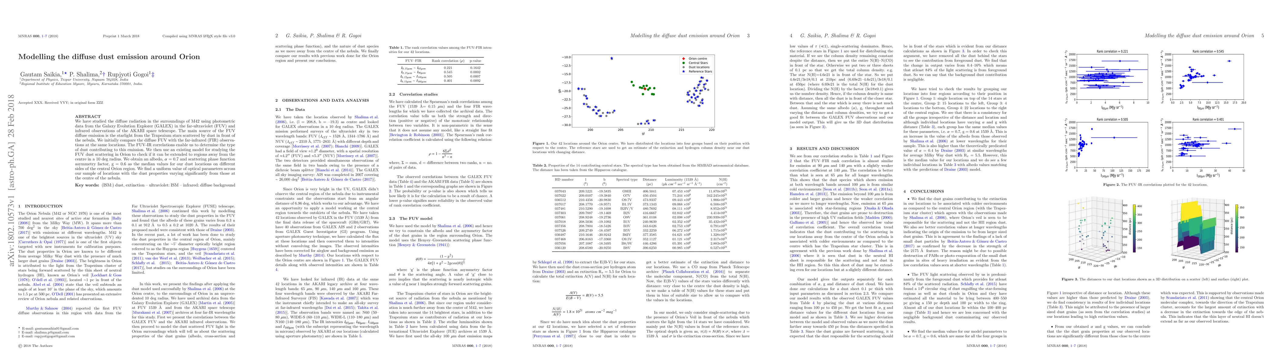 This study models the diffuse dust emission around Orion using GALEX FUV and AKARI FIR data, finding that the FUV emission is primarily from starlight scattered by dust. The analysis reveals a uniform albedo and asymmetry factor across various locations, indicating significant dust property variation from the nebula's center.