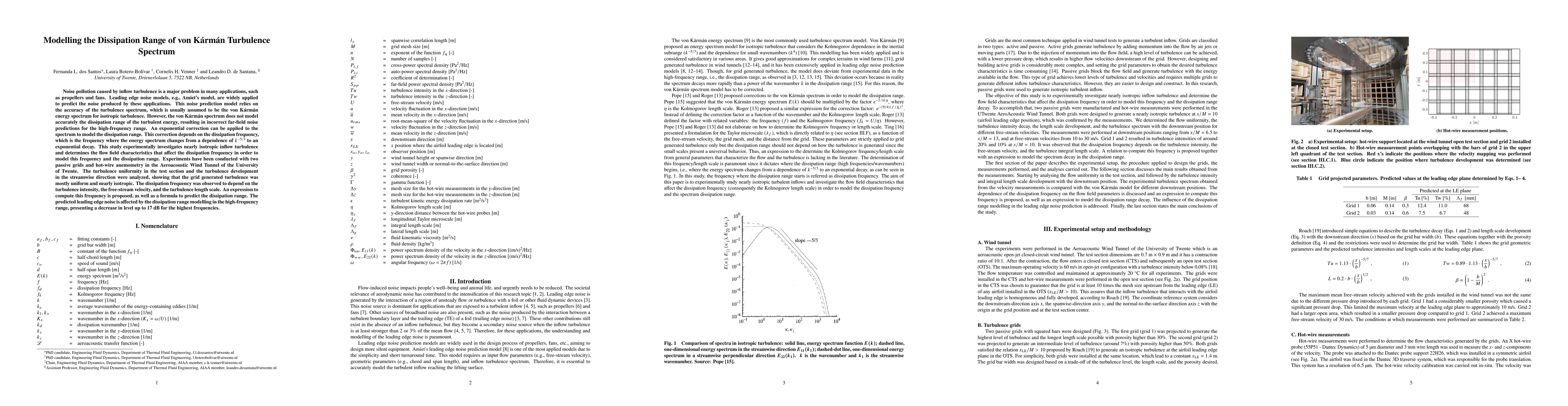 This study experimentally investigates the dissipation range of the von Kármán turbulence spectrum to improve the accuracy of leading edge noise prediction models. It proposes a method to determine the dissipation frequency based on turbulence intensity, free-stream velocity, and turbulence length scale, leading to a significant reduction in predicted high-frequency noise levels up to 17 dB.