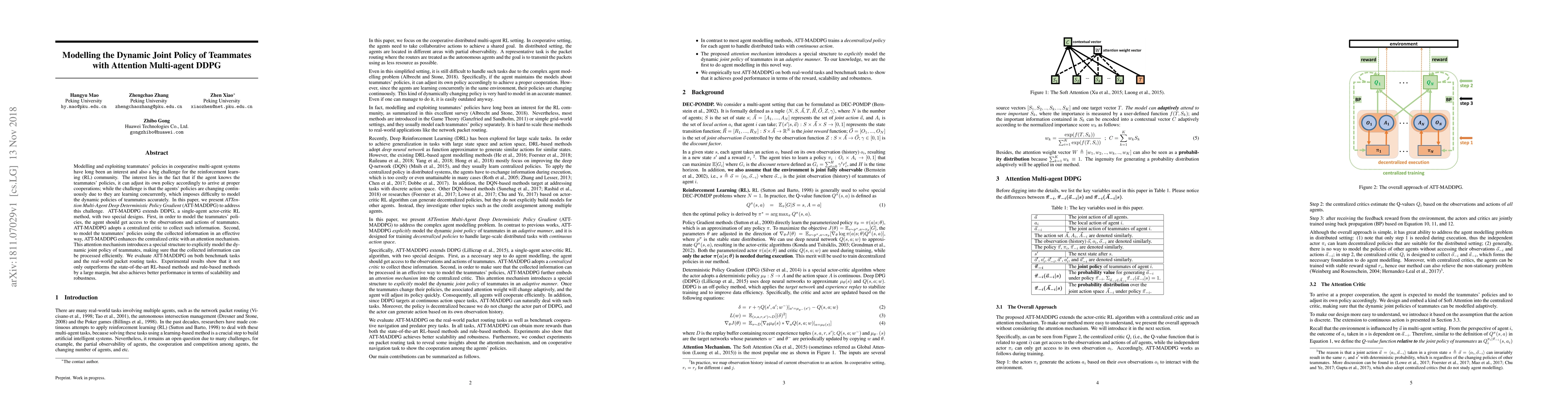 This paper proposes ATT-MADDPG, an extension of DDPG with an attention mechanism, to model dynamic joint policies of teammates in multi-agent reinforcement learning. It utilizes a centralized critic enhanced with attention to efficiently process teammate observations and actions, demonstrating superior performance and scalability in various tasks.