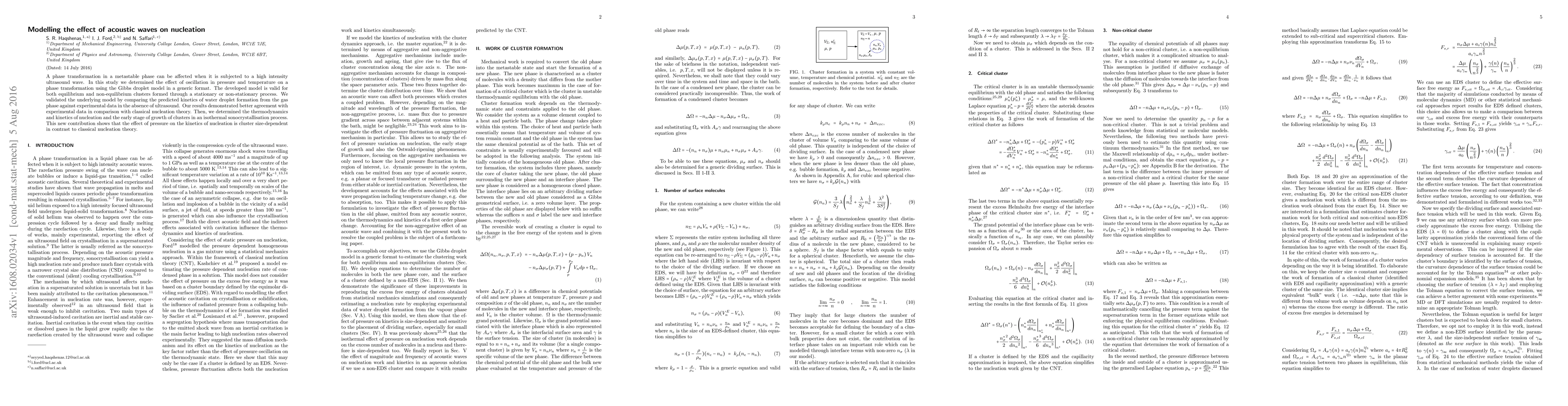 A phase transformation in a metastable phase can be affected when it is subjected to a high intensity ultrasound wave. In this study we determined the effect of oscillation in pressure and temperature on a phase transformation using the Gibbs droplet model in a generic format. The developed model is valid for both equilibrium and non-equilibrium clusters formed through a stationary or non-stationary process. We validated the underlying model by comparing the predicted kinetics of water droplet formation from the gas phase against experimental data in the absence of ultrasound. Our results demonstrated better agreement with experimental data in comparison with classical nucleation theory. Then, we determined the thermodynamics and kinetics of nucleation and the early stage of growth of clusters in an isothermal sonocrystallisation process. This new contribution shows that the effect of pressure on the kinetics of nucleation is cluster size-dependent in contrast to classical nucleation theory.