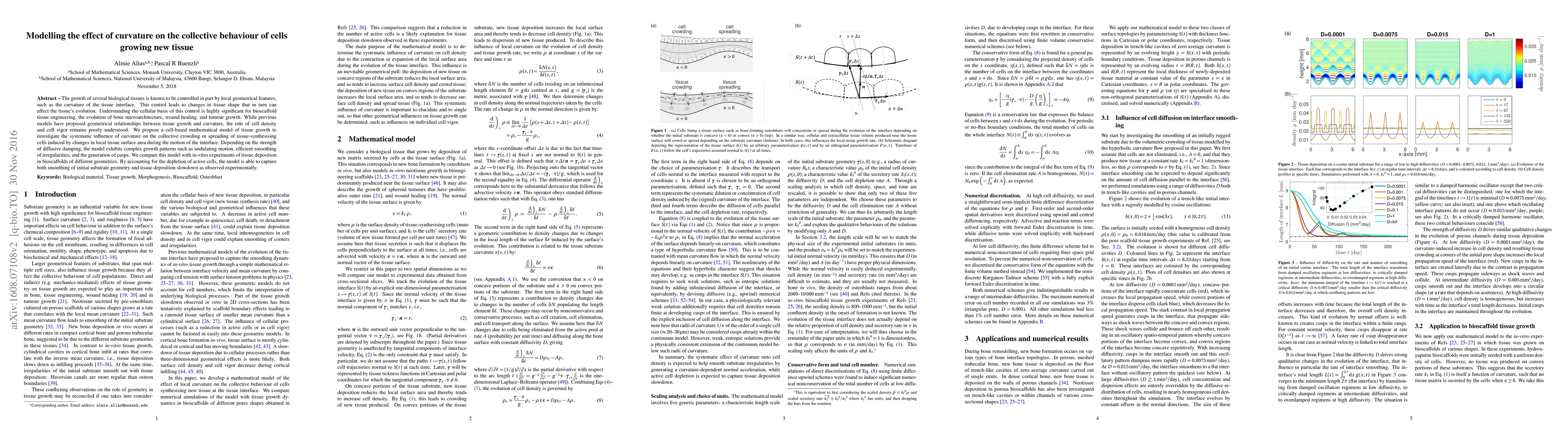 The growth of several biological tissues is known to be controlled in part by local geometrical features, such as the curvature of the tissue interface. This control leads to changes in tissue shape that in turn can affect the tissue's evolution. Understanding the cellular basis of this control is highly significant for bioscaffold tissue engineering, the evolution of bone microarchitecture, wound healing, and tumour growth. While previous models have proposed geometrical relationships between tissue growth and curvature, the role of cell density and cell vigor remains poorly understood. We propose a cell-based mathematical model of tissue growth to investigate the systematic influence of curvature on the collective crowding or spreading of tissue-synthesising cells induced by changes in local tissue surface area during the motion of the interface. Depending on the strength of diffusive damping, the model exhibits complex growth patterns such as undulating motion, efficient smoothing of irregularities, and the generation of cusps. We compare this model with in-vitro experiments of tissue deposition in bioscaffolds of different geometries. By accounting for the depletion of active cells, the model is able to capture both smoothing of initial substrate geometry and tissue deposition slowdown as observed experimentally.