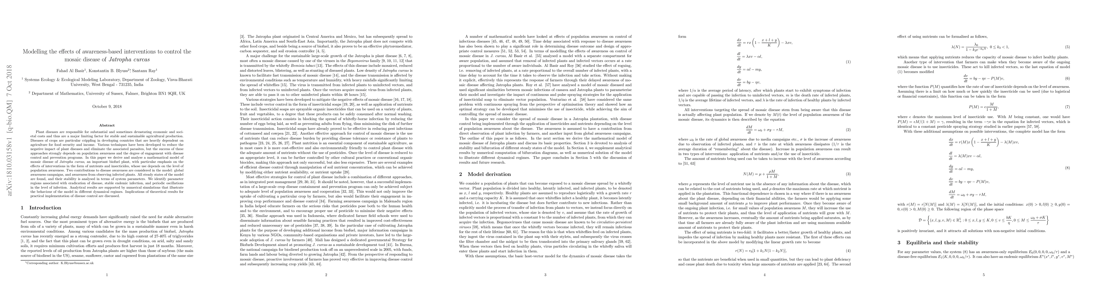 Plant diseases are responsible for substantial and sometimes devastating economic and societal costs and thus are a major limiting factor for stable and sustainable agricultural production. Diseases of crops are particular crippling in developing countries that are heavily dependent on agriculture for food security and income. Various techniques have been developed to reduce the negative impact of plant diseases and eliminate the associated parasites, but the success of these approaches strongly depends on population awareness and the degree of engagement with disease control and prevention programs. In this paper we derive and analyse a mathematical model of mosaic disease of {\it Jatropha curcas}, an important biofuel plant, with particular emphasis on the effects of interventions in the form of nutrients and insecticides, whose use depends on the level of population awareness. Two contributions to disease awareness are considered in the model: global awareness campaigns, and awareness from observing infected plants. All steady states of the model are found, and their stability is analysed in terms of system parameters. We identify parameter regions associated with eradication of disease, stable endemic infection, and periodic oscillations in the level of infection. Analytical results are supported by numerical simulations that illustrate the behaviour of the model in different dynamical regimes. Implications of theoretical results for practical implementation of disease control are discussed.