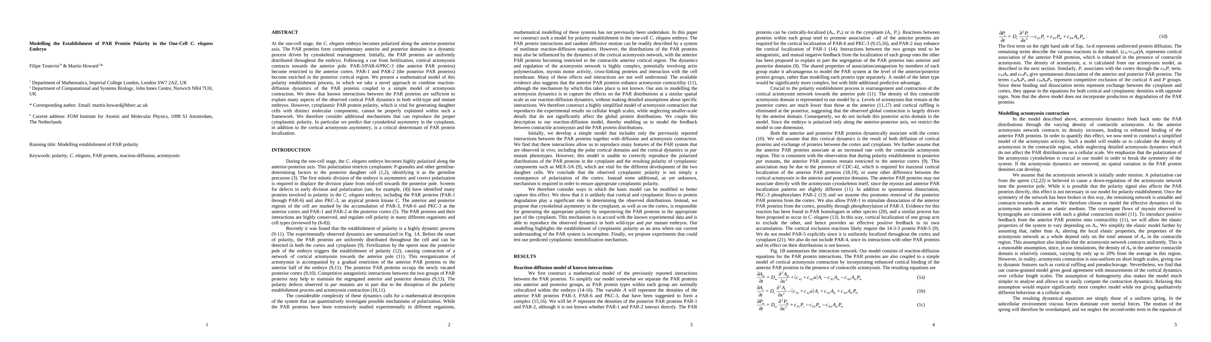 This paper models the establishment of PAR protein polarity in C. elegans one-cell embryos, showing that reaction-diffusion dynamics coupled with actomyosin contraction can explain cortical PAR protein distribution. However, it identifies additional mechanisms, such as cytoplasmic cytoskeletal asymmetry, necessary for proper cytoplasmic PAR protein localization.