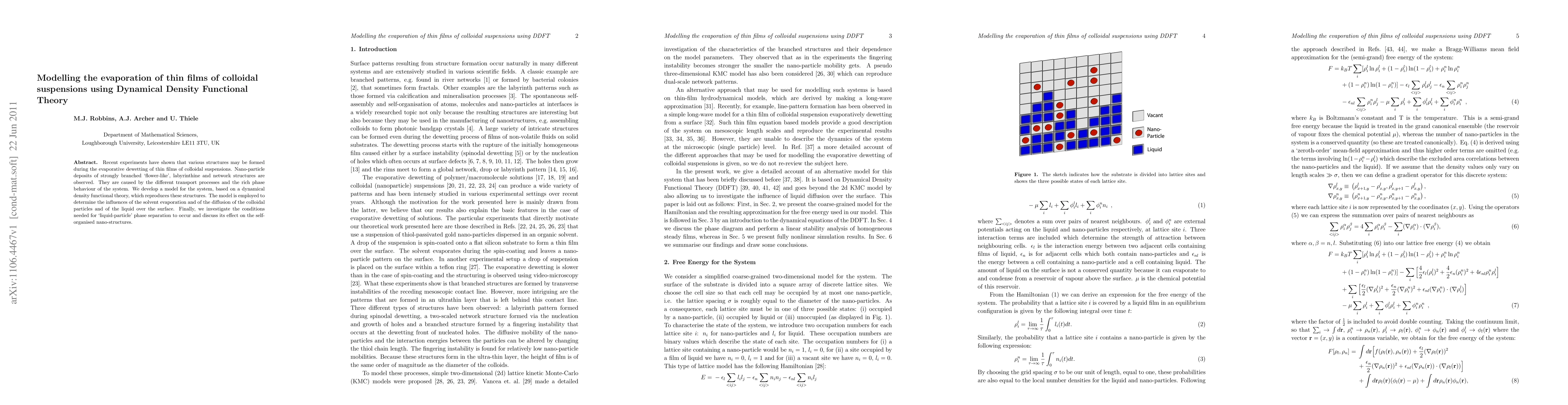 This paper develops a dynamical density functional theory model to simulate the evaporation of thin colloidal suspension films, capturing the formation of branched, labyrinthine, and network nano-particle structures. The model analyzes the effects of solvent evaporation and particle diffusion on these structures and explores conditions for liquid-particle phase separation.