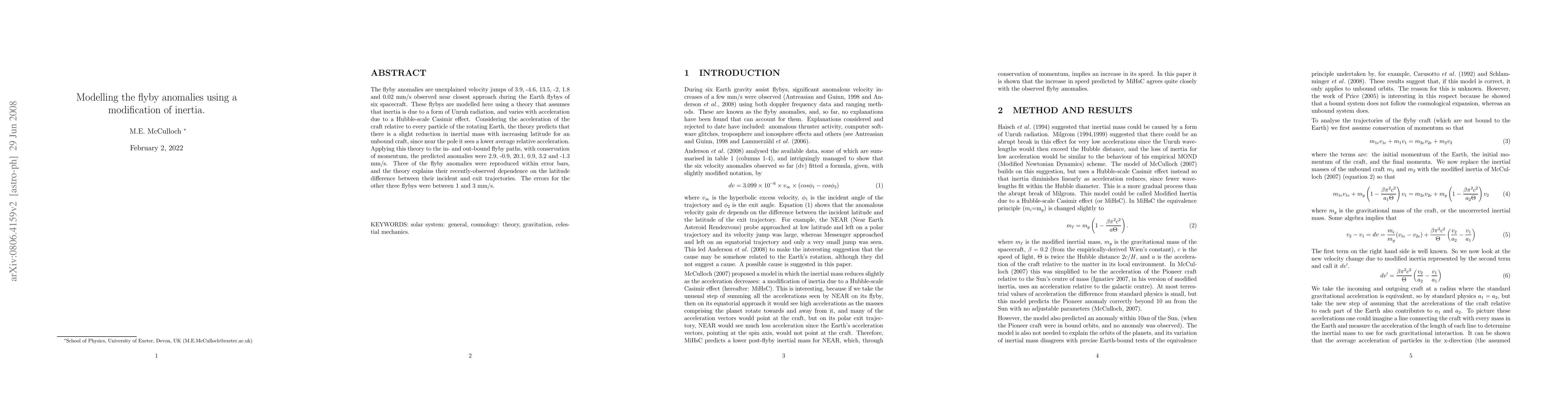 This paper proposes a modified inertia theory based on Unruh radiation and a Hubble-scale Casimir effect to model the unexplained flyby anomalies observed in spacecraft velocity changes. The model successfully reproduces three anomalies within error margins and explains the anomalies' dependence on latitude differences.