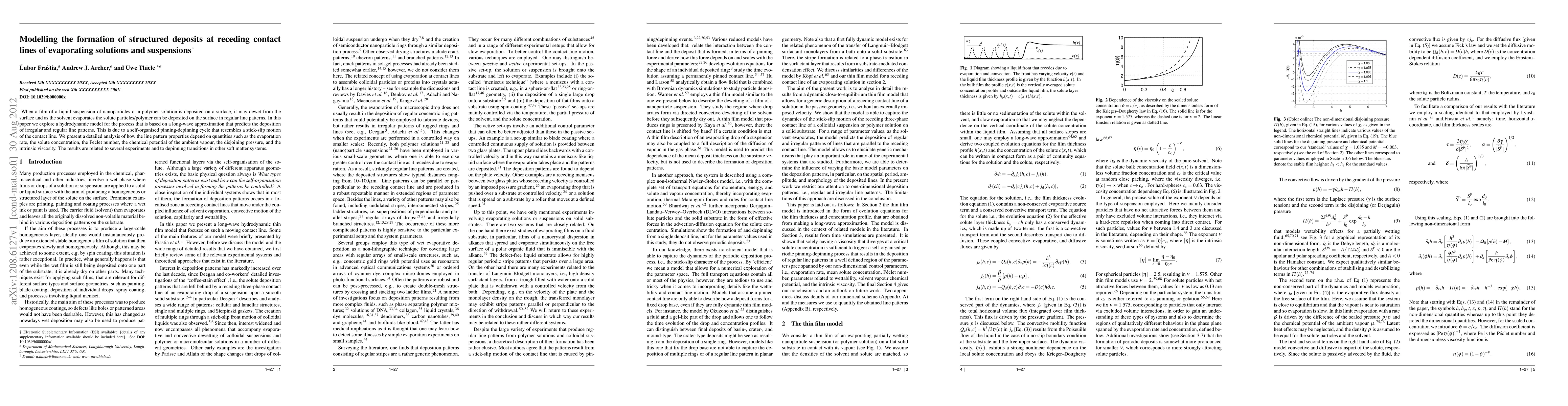 When a film of a liquid suspension of nanoparticles or a polymer solution is deposited on a surface, it may dewet from the surface and as the solvent evaporates the solute particles/polymer can be deposited on the surface in regular line patterns. In this paper we explore a hydrodynamic model for the process that is based on a long-wave approximation that predicts the deposition of irregular and regular line patterns. This is due to a self-organised pinning-depinning cycle that resembles a stick-slip motion of the contact line. We present a detailed analysis of how the line pattern properties depend on quantities such as the evaporation rate, the solute concentration, the P\'eclet number, the chemical potential of the ambient vapour, the disjoining pressure, and the intrinsic viscosity. The results are related to several experiments and to depinning transitions in other soft matter systems.