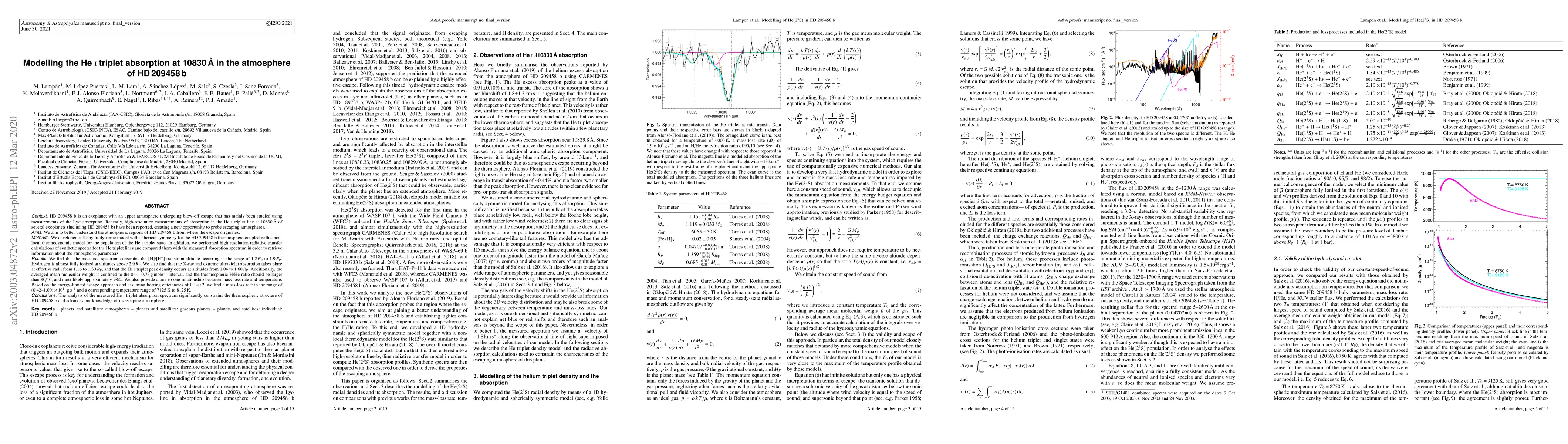 This study investigates the He I triplet absorption at 10830 angstroms in the atmosphere of HD 209458b using a 1D hydrodynamic model and radiative transfer calculations. The analysis reveals key atmospheric parameters and mass-loss rates, providing insights into the exoplanet's escaping atmosphere.