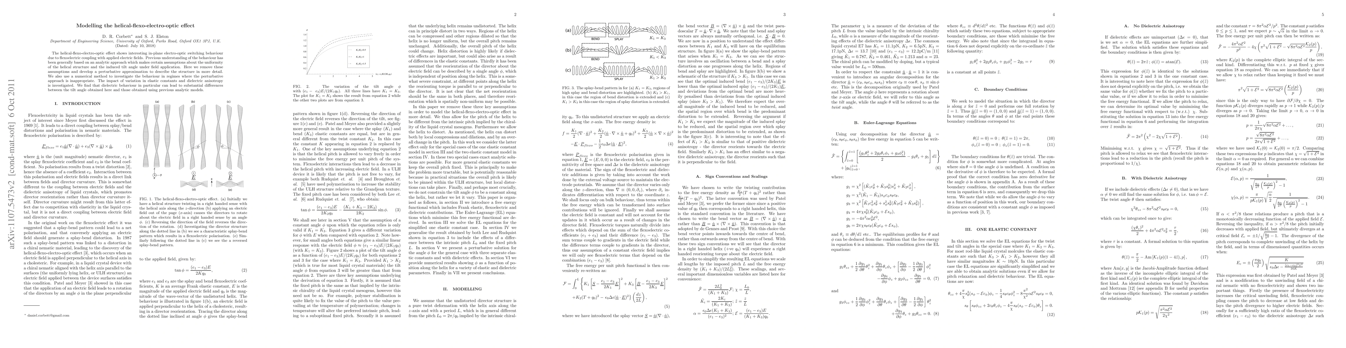 This paper models the helical-flexo-electro-optic effect using a perturbative approximation and numerical methods, revealing substantial differences in tilt angle due to dielectric behaviour compared to previous analytic models, challenging assumptions about helical structure uniformity.