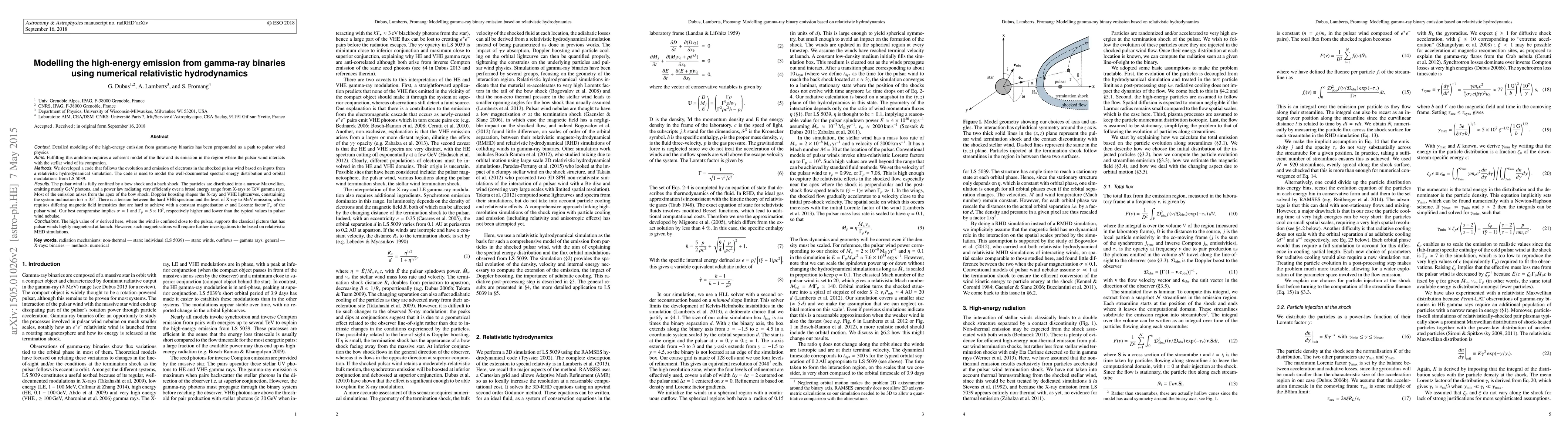 This paper models high-energy emissions from gamma-ray binaries using relativistic hydrodynamics, focusing on LS 5039. The study finds that the pulsar wind is confined by shocks, leading to GeV photon emission and a broad energy spectrum from X-rays to TeV gamma rays, with most emission from the bow shock apex. The model suggests higher magnetisation and lower Lorentz factor for the pulsar wind compared to typical values.