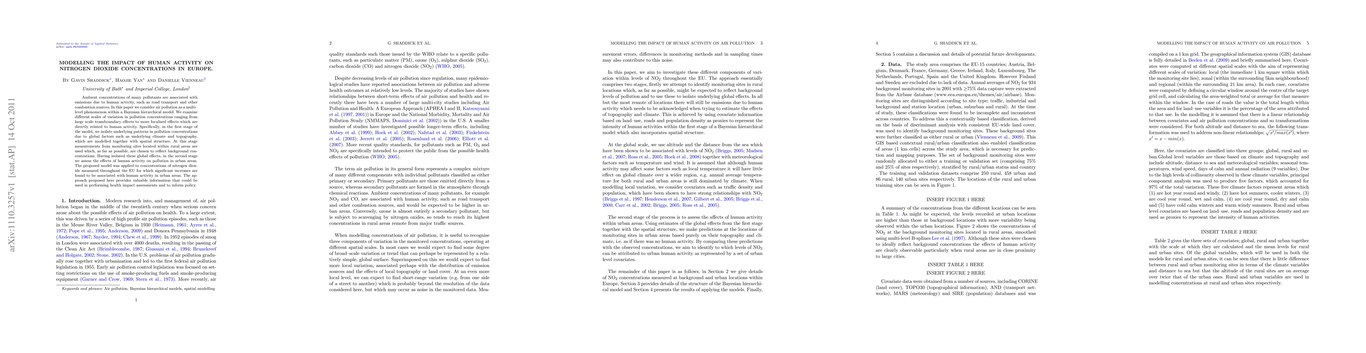 This paper develops a Bayesian hierarchical model to assess the impact of human activity on nitrogen dioxide concentrations in Europe, distinguishing between global factors and localized urban effects. The model reveals significant increases in nitrogen dioxide levels in urban areas due to human activities, offering insights for health impact assessments and policy-making.