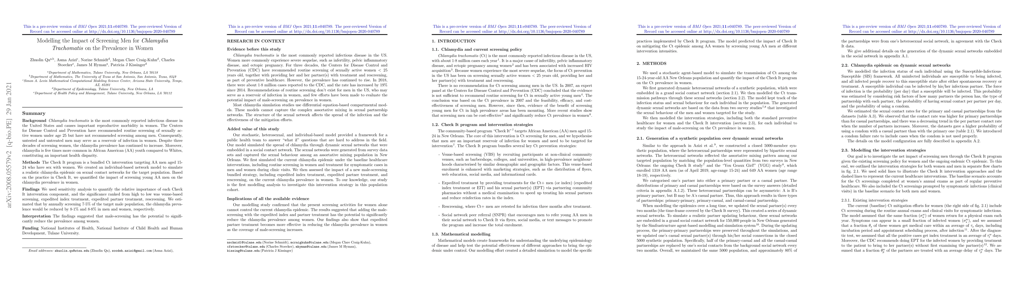 This study models the impact of screening African American men for Chlamydia trachomatis, finding that it could reduce the prevalence in women by 8.1% and 8.8% respectively. The Check It program's components, ranked by effectiveness, include venue-based screening, expedited index treatment, expedited partner treatment, and rescreening.