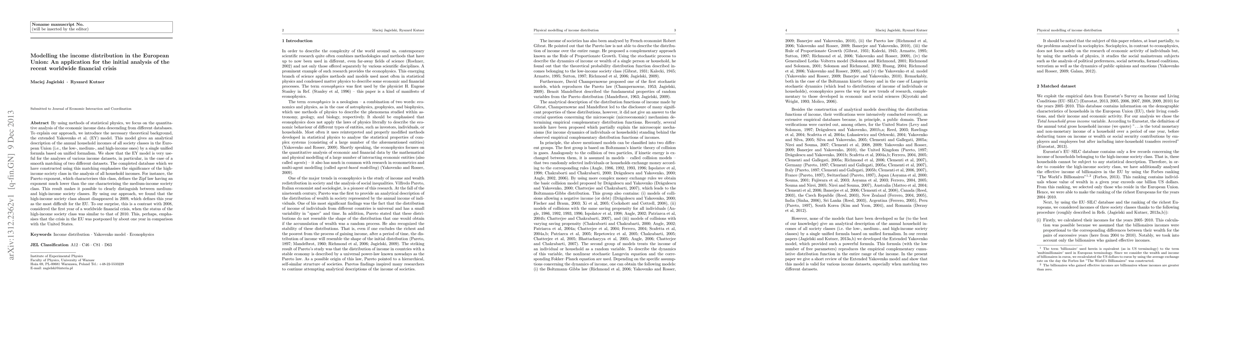 By using methods of statistical physics, we focus on the quantitative analysis of the economic income data descending from different databases. To explain our approach, we introduce the necessary theoretical background, the extended Yakovenko et al. (EY) model. This model gives an analytical description of the annual household incomes of all society classes in the European Union (i.e., the low-, medium-, and high-income ones) by a single unified formula based on unified formalism. We show that the EY model is very useful for the analyses of various income datasets, in particular, in the case of a smooth matching of two different datasets. The completed database which we have constructed using this matching emphasises the significance of the high-income society class in the analysis of all household incomes. For instance, the Pareto exponent, which characterises this class, defines the Zipf law having an exponent much lower than the one characterising the medium-income society class. This result makes it possible to clearly distinguish between medium- and high-income society classes. By using our approach, we found that the high-income society class almost disappeared in 2009, which defines this year as the most difficult for the EU. To our surprise, this is a contrast with 2008, considered the first year of a worldwide financial crisis, when the status of the high-income society class was similar to that of 2010. This, perhaps, emphasises that the crisis in the EU was postponed by about one year in comparison with the United States.