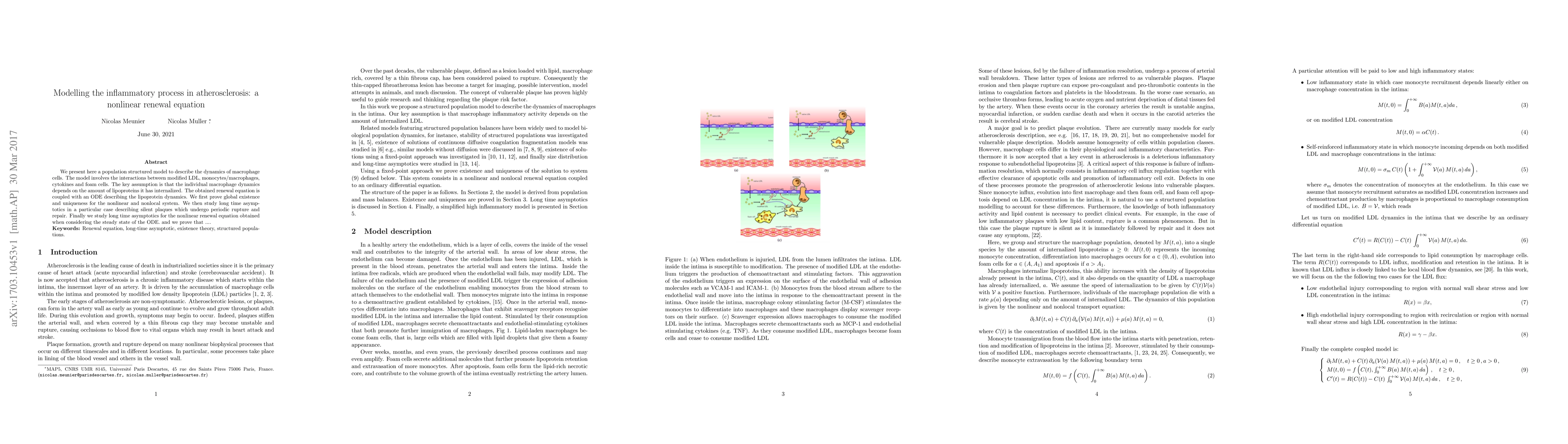 We present here a population structured model to describe the dynamics of macrophage cells. The model involves the interactions between modified LDL, monocytes/macrophages, cytokines and foam cells. The key assumption is that the individual macrophage dynamics depends on the amount of lipoproteins it has internalized. The obtained renewal equation is coupled with an ODE describing the lipoprotein dynamics. We first prove global existence and uniqueness for the nonlinear and nonlocal system. We then study long time asymp-totics in a particular case describing silent plaques which undergo periodic rupture and repair. Finally we study long time asymptotics for the nonlinear renewal equation obtained when considering the steady state of the ODE. and we prove that ....
