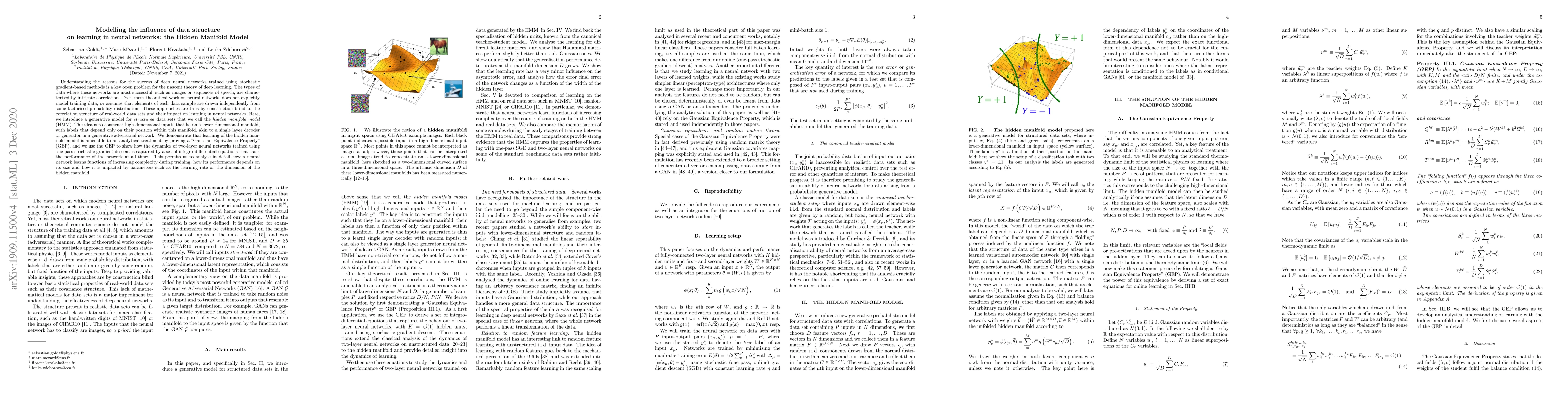 This paper introduces the hidden manifold model (HMM) to better understand how data structure influences learning in neural networks. It demonstrates that neural networks trained on data lying on a lower-dimensional manifold can be analytically treated using a "Gaussian Equivalence Property" (GEP), which helps analyze network performance and learning dynamics.
