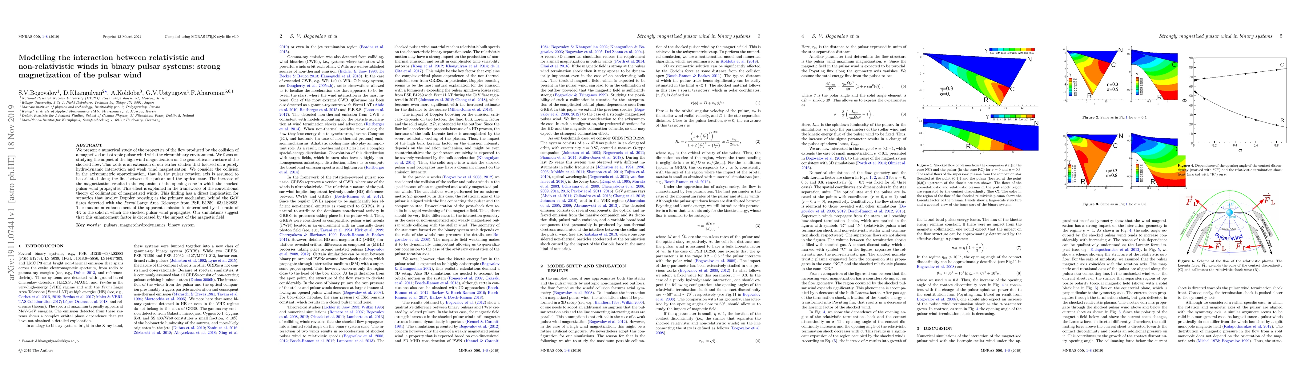 We present a numerical study of the properties of the flow produced by the collision of a magnetized anisotropic pulsar wind with the circumbinary environment. We focus on studying the impact of the high wind magnetization on the geometrical structure of the shocked flow. This work is an extension of our earlier studies that focused on a purely hydrodynamic interaction and weak wind magnetization. We consider the collision in the axisymmetric approximation, that is, the pulsar rotation axis is assumed to be oriented along the line between the pulsar and the optical star. The increase of the magnetization results in the expansion of the opening cone in which the shocked pulsar wind propagates. This effect is explained in the frameworks of the conventional theory of collimation of magnetized winds. This finding has a direct implication for scenarios that involve Doppler boosting as the primary mechanism behind the GeV flares detected with the Fermi/LAT from PSR B1259-63/LS2883. The maximum enhancement of the apparent emission is determined by the ratio of $4\pi$ to the solid in which the shocked pulsar wind propagates. Our simulations suggest that this enhancement factor is decreased by the impact of the magnetic field.
