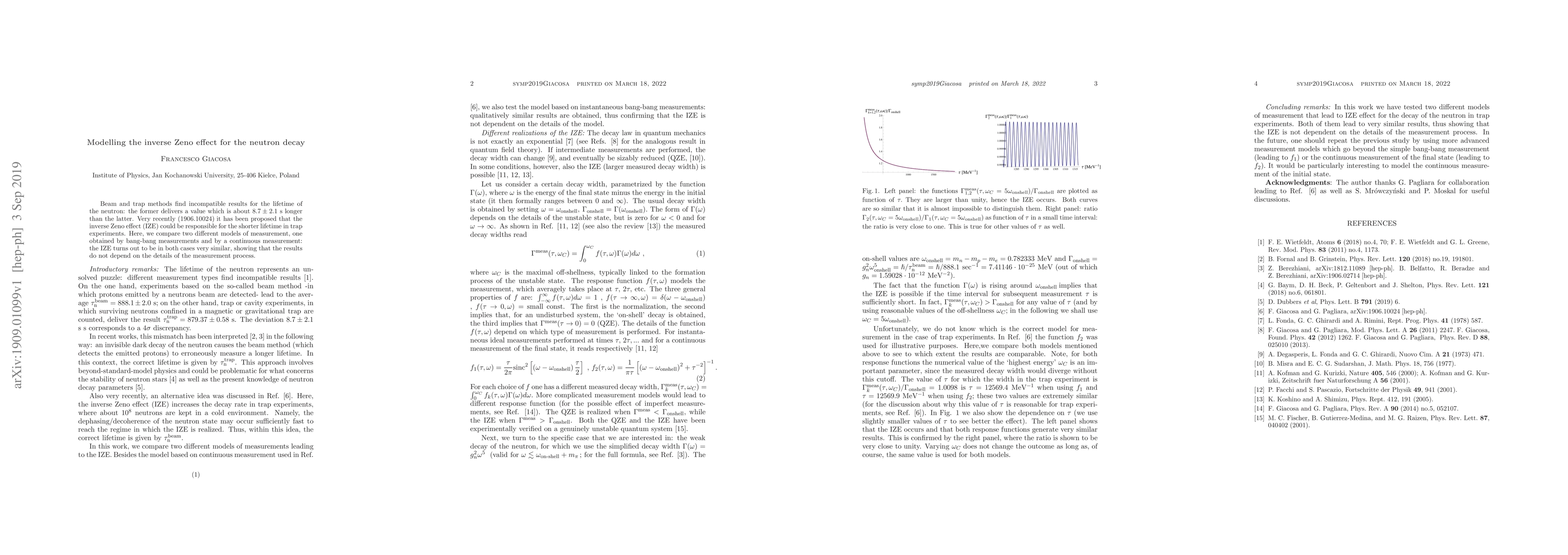 Beam and trap methods find incompatible results for the lifetime of the neutron: the former delivers a value which is about $8.7\pm2.1$ s longer than the latter. Very recently (1906.10024) it has been proposed that the inverse Zeno effect (IZE) could be responsible for the shorter lifetime in trap experiments. Here, we compare two different models of measurement, one obtained by bang-bang measurements and by a continuous measurement: the IZE turns out to be in both cases very similar, showing that the results do not depend on the details of the measurement process.