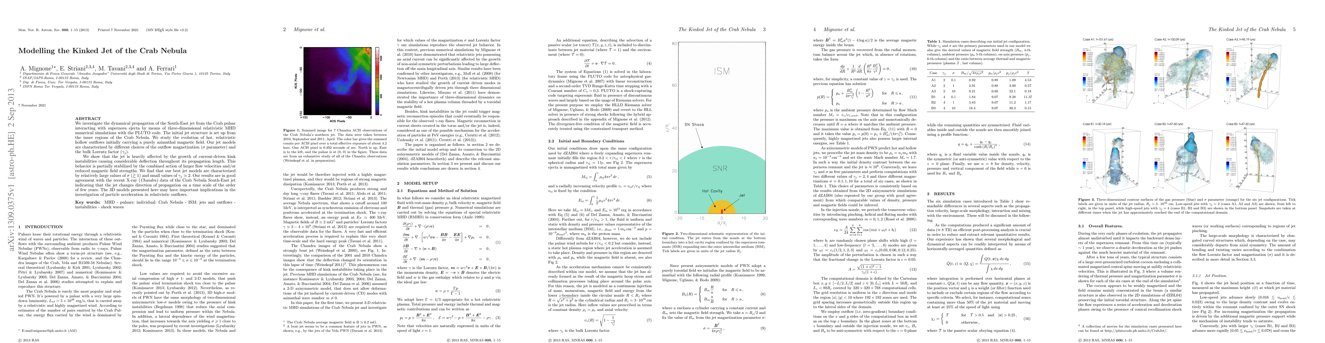Researchers used computer simulations to study the Crab Nebula's South-East jet, finding it's heavily affected by kink instabilities that cause deflection over time. The models suggest larger magnetic field strengths and flow velocities can stabilize this behavior.