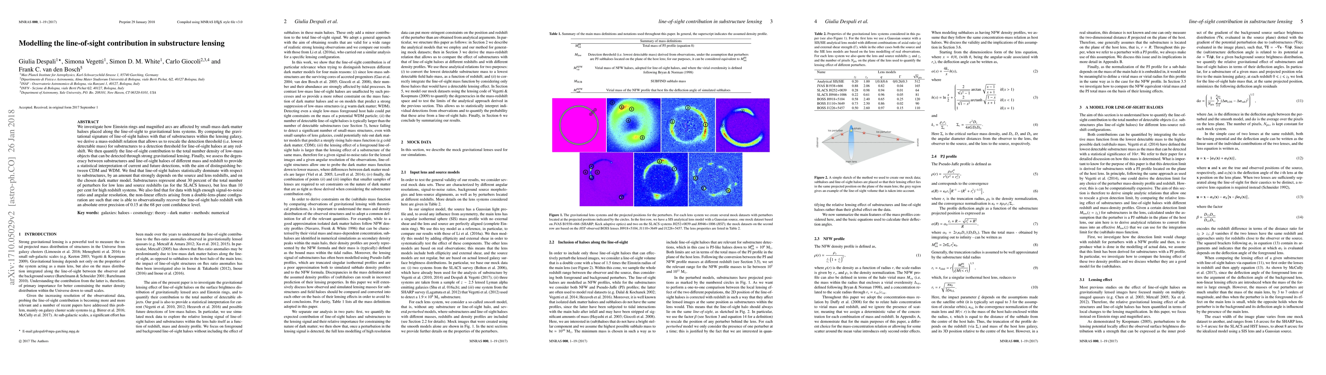 This paper models the influence of small-mass dark-matter haloes along the line-of-sight on Einstein rings and magnified arcs, deriving a mass-redshift relation to rescale substructure detection thresholds. It finds that line-of-sight haloes statistically dominate substructures in gravitational lensing, with their contribution significantly varying depending on redshifts and dark matter models.
