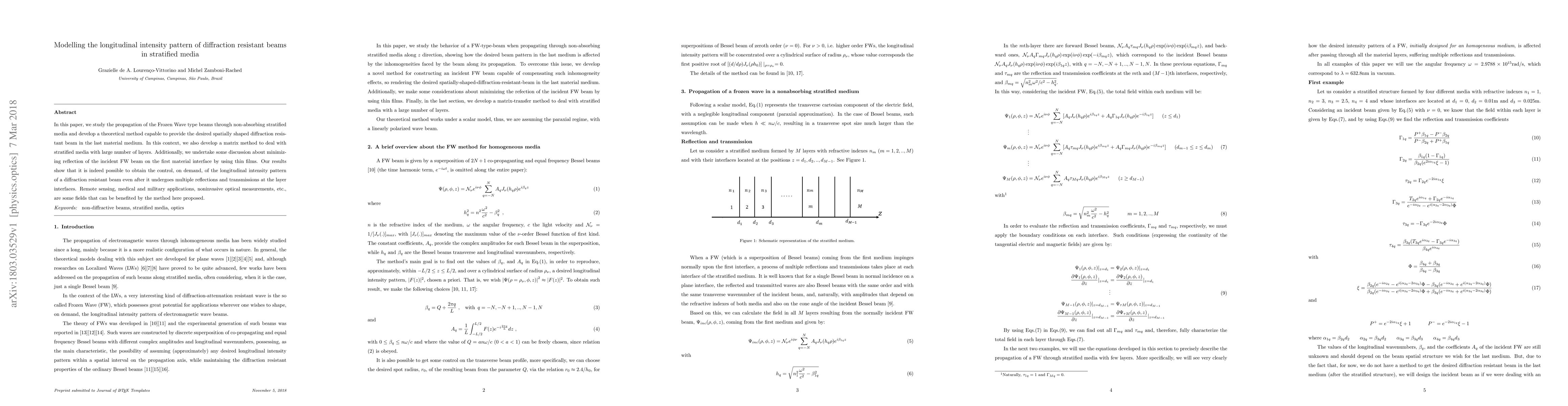 This paper develops a theoretical method to model the propagation of Frozen Wave beams through stratified media, achieving spatially shaped, diffraction-resistant beams. It also introduces a matrix method for handling stratified media with many layers and discusses minimizing reflections using thin films. The method enables control over the longitudinal intensity pattern of diffraction-resistant beams, with potential applications in remote sensing, medical, and military fields.
