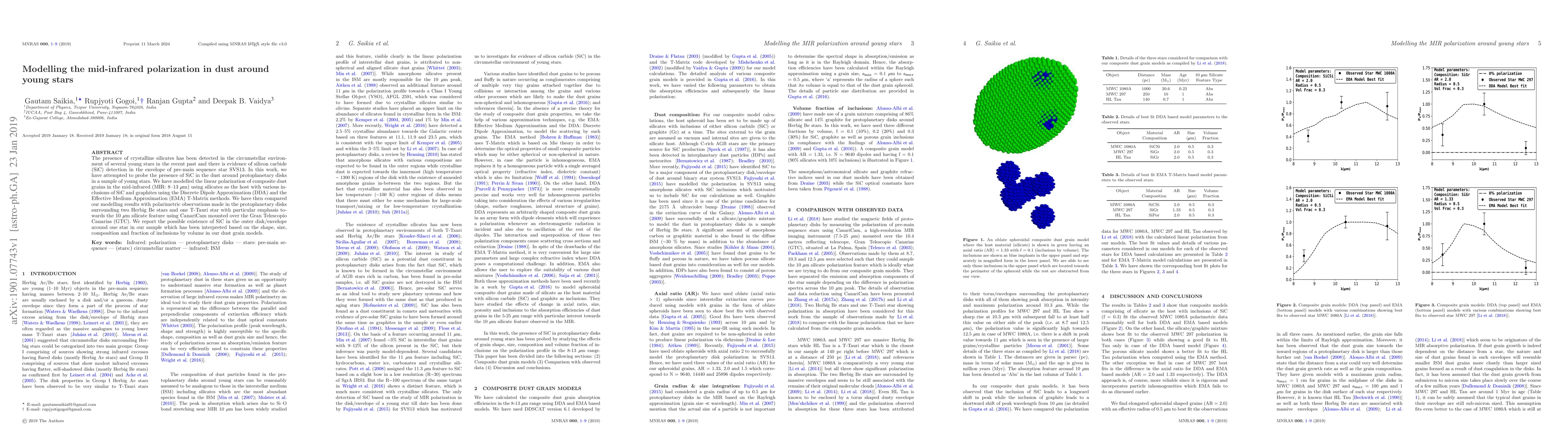 The presence of crystalline silicates has been detected in the circumstellar environment of several young stars in the recent past and there is evidence of silicon carbide (SiC) detection in the envelope of pre-main sequence star SVS13. In this work, we have attempted to probe the presence of SiC in the dust around protoplanetary disks in a sample of young stars. We have modelled the linear polarization of composite dust grains in the mid-infrared (MIR: 8--13 $\mu$m) using silicates as the host with various inclusions of SiC and graphites using the Discrete Dipole Approximation (DDA) and the Effective Medium Approximation (EMA) T-Matrix methods. We have then compared our modelling results with polarimetric observations made in the protoplanetary disks surrounding two Herbig Be stars and one T-Tauri star with particular emphasis towards the 10 $\mu$m silicate feature using CanariCam mounted over the Gran Telescopio Canarias (GTC). We report the possible existence of SiC in the outer disk/envelope around one star in our sample which has been interpreted based on the shape, size, composition and fraction of inclusions by volume in our dust grain models.