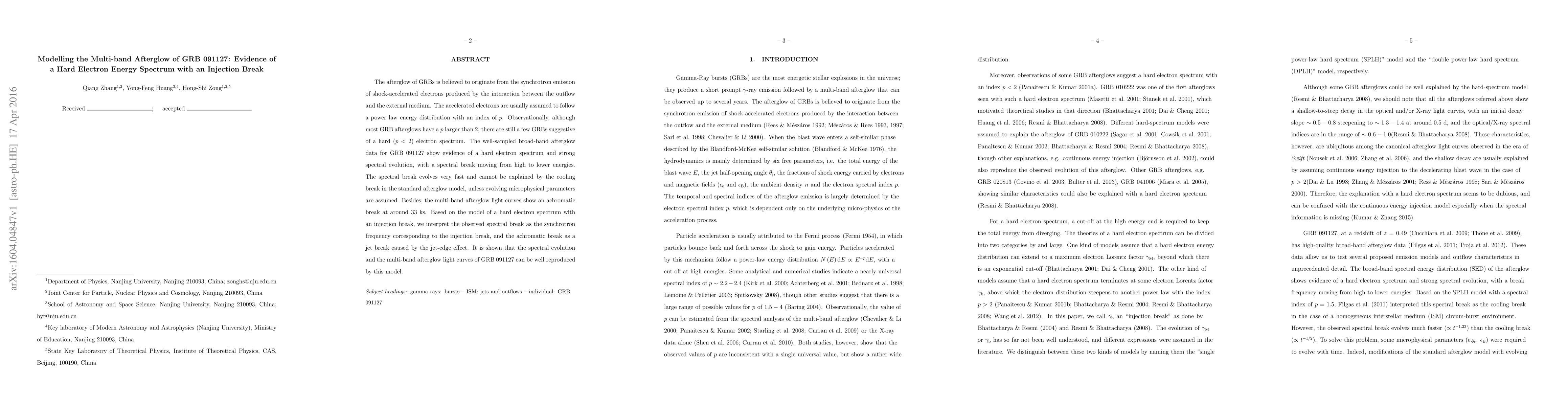 The paper models GRB 091127's multi-band afterglow, suggesting a hard electron spectrum with an injection break. It explains the fast spectral break and achromatic break observed, attributing them to the injection break and jet break, respectively, fitting the data well with this model.