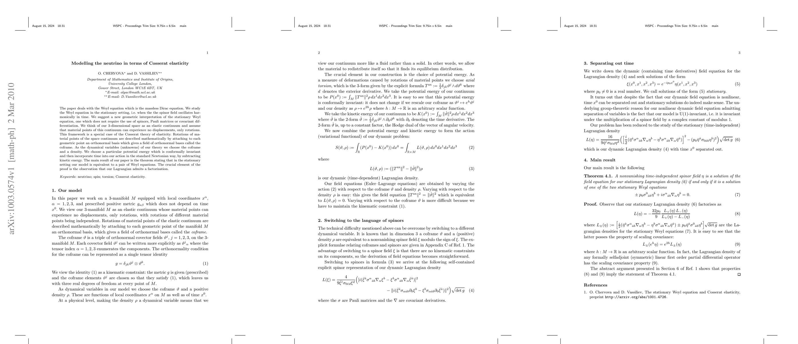 The paper deals with the Weyl equation which is the massless Dirac equation. We study the Weyl equation in the stationary setting, i.e. when the the spinor field oscillates harmonically in time. We suggest a new geometric interpretation of the stationary Weyl equation, one which does not require the use of spinors, Pauli matrices or covariant differentiation. We think of our 3-dimensional space as an elastic continuum and assume that material points of this continuum can experience no displacements, only rotations. This framework is a special case of the Cosserat theory of elasticity. Rotations of material points of the space continuum are described mathematically by attaching to each geometric point an orthonormal basis which gives a field of orthonormal bases called the coframe. As the dynamical variables (unknowns) of our theory we choose the coframe and a density. We choose a particular potential energy which is conformally invariant and then incorporate time into our action in the standard Newtonian way, by subtracting kinetic energy. The main result of our paper is the theorem stating that in the stationary setting our model is equivalent to a pair of Weyl equations. The crucial element of the proof is the observation that our Lagrangian admits a factorisation.