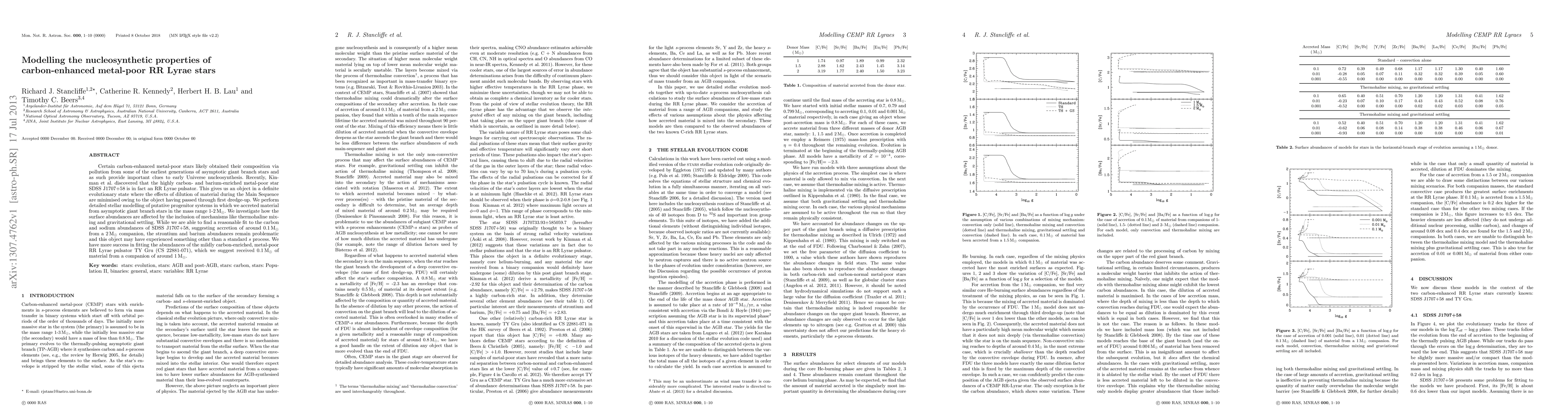 This paper models the nucleosynthetic properties of carbon-enhanced metal-poor RR Lyrae stars, focusing on SDSS J1707+58 and TY Gru. It finds that accretion from asymptotic giant branch stars can explain the carbon and sodium abundances, suggesting material transfer from 2 solar mass and 1 solar mass companions, respectively.
