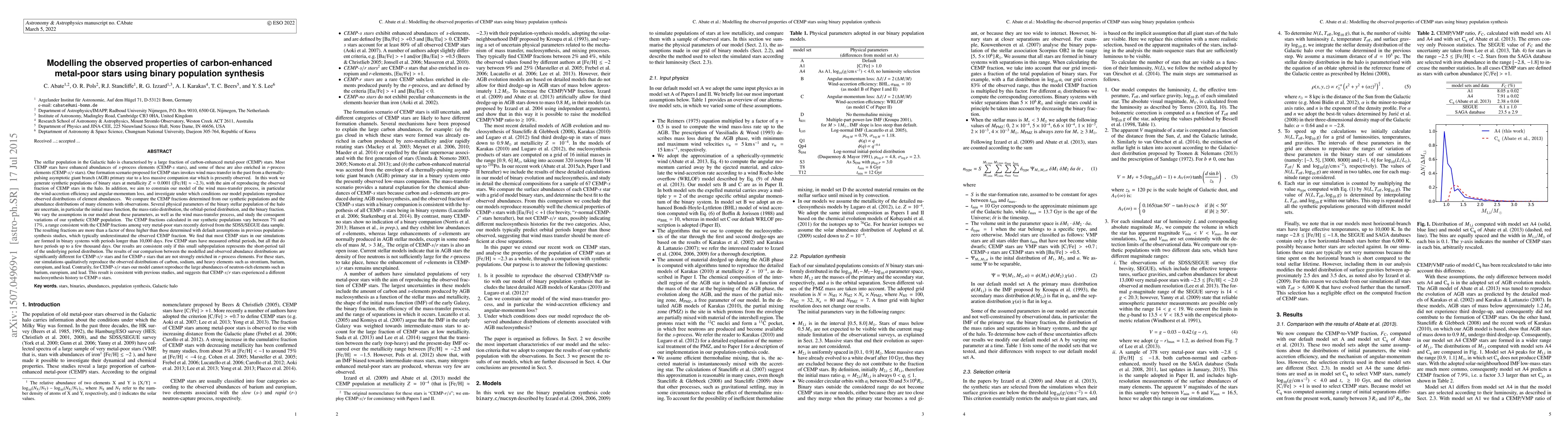 A study models the formation of carbon-enhanced metal-poor stars using binary population synthesis, finding that their abundance distributions vary between 7% to 17% CEMP fractions and differ in reproducing neutron-rich element abundances for s/r and s star types.