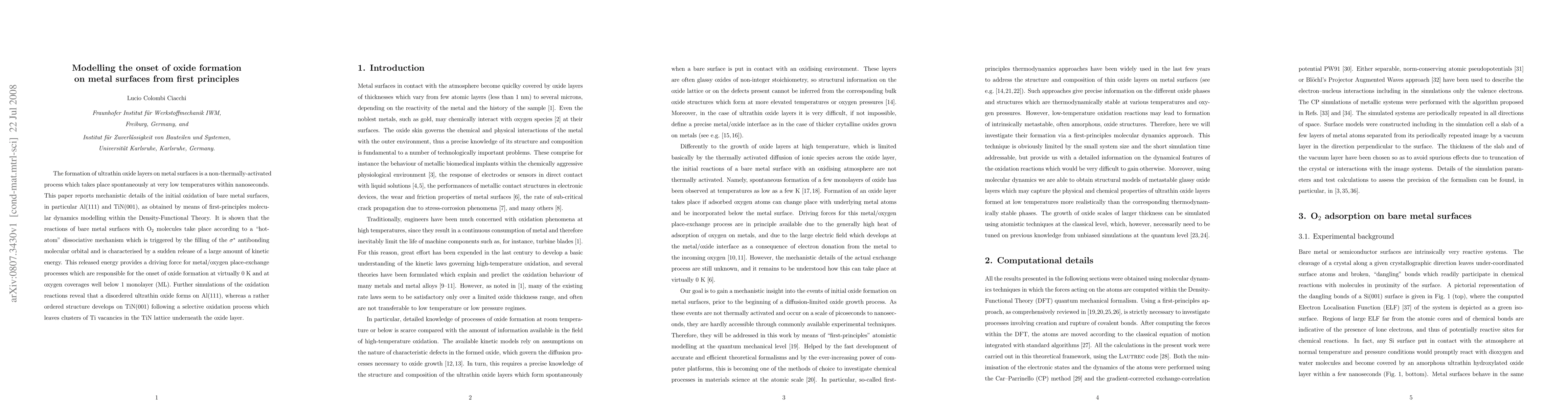 This study utilizes first-principles molecular dynamics and Density-Functional Theory to detail the spontaneous formation of ultrathin oxide layers on Al(111) and TiN(001) surfaces at low temperatures, revealing a 'hot-atom' dissociative mechanism triggered by filling of the sigma-star antibonding orbital, leading to disordered oxide on Al(111) and ordered oxide with Ti vacancies on TiN(001).