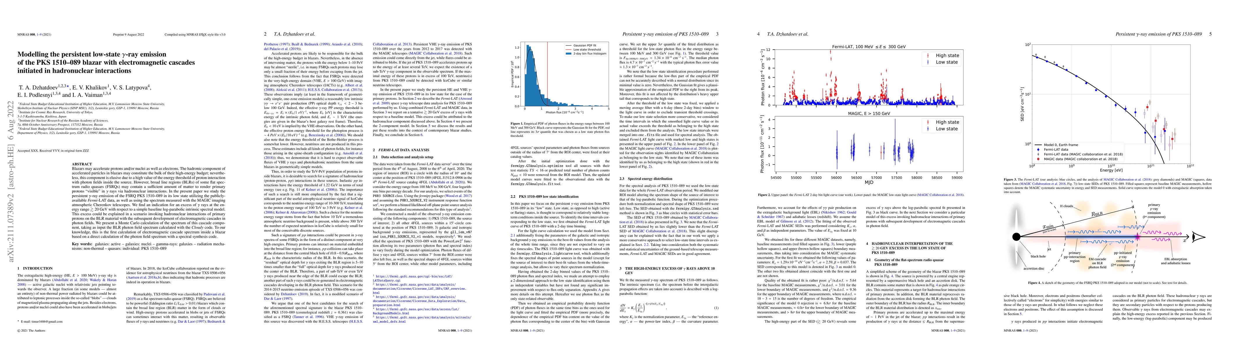This paper investigates the persistent low-state $\gamma$-ray emission of the FSRQ PKS 1510-089, suggesting an excess of $\gamma$ rays at energies $\gtrsim 20$ GeV. The authors propose that this excess may be due to hadronuclear interactions in the broad line region, leading to electromagnetic cascades, and present a novel Monte Carlo calculation based on a direct photon field spectrum synthesis.