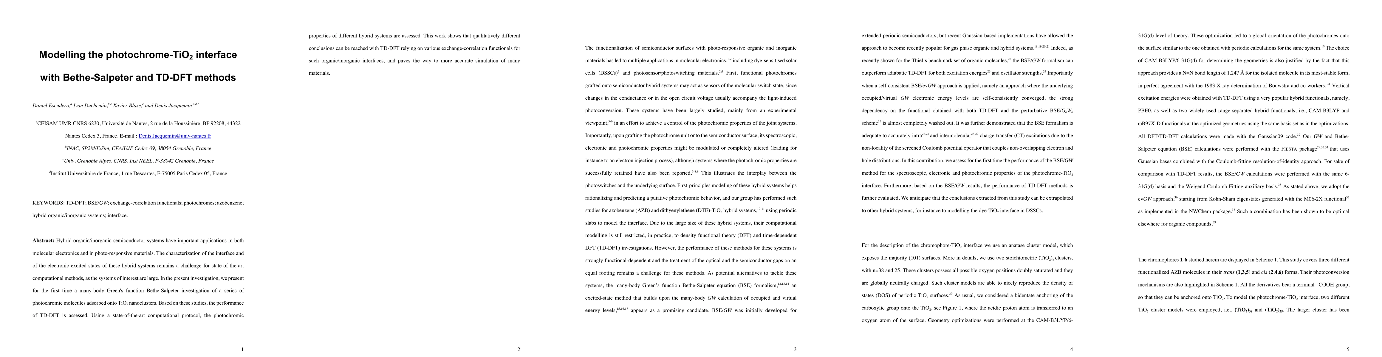 Hybrid organic/inorganic-semiconductor systems have important applications in both molecular electronics and in photo-responsive materials. The characterization of the interface and of the electronic excited-states of these hybrid systems remains a challenge for state-of-the-art computational methods, as the systems of interest are large. In the present investigation, we present for the first time a many-body Green's function Bethe-Salpeter investigation of a series of photochromic molecules adsorbed onto TiO2 nanoclusters. Based on these studies, the performance of TD-DFT is assessed. Using a state-of-the-art computational protocol, the photochromic properties of different hybrid systems are assessed. This work shows that qualitatively different conclusions can be reached with TD-DFT relying on various exchange-correlation functionals for such organic/inorganic interfaces, and paves the way to more accurate simulation of many materials.