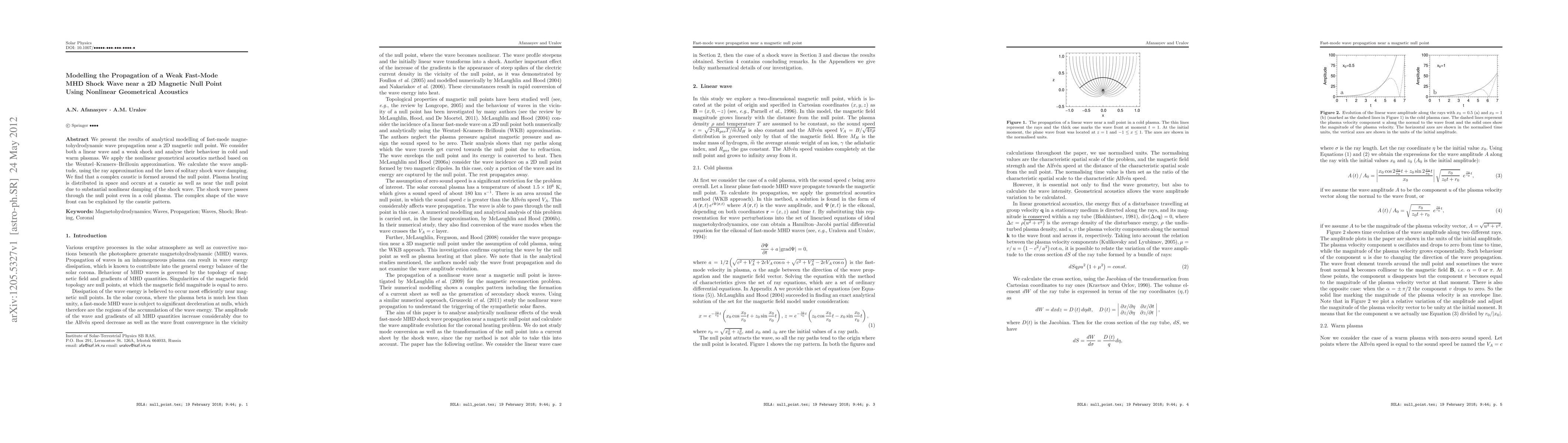 This paper models the propagation of a weak fast-mode MHD shock wave near a 2D magnetic null point using nonlinear geometrical acoustics. It finds complex caustic formation and substantial nonlinear damping leading to distributed plasma heating, with the shock wave passing through the null point despite being cold.