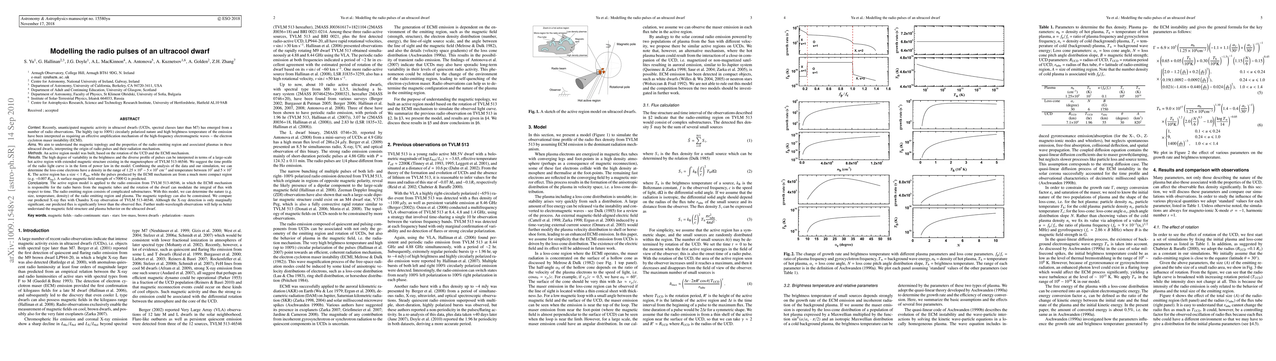 This paper models the radio pulses of ultracool dwarfs, attributing their high brightness and circular polarization to the electron cyclotron maser instability. The study proposes a model based on the rotation of the dwarf and ECMI to understand the magnetic topology and properties of the radio emitting region, suggesting a power law for the radio light curve.