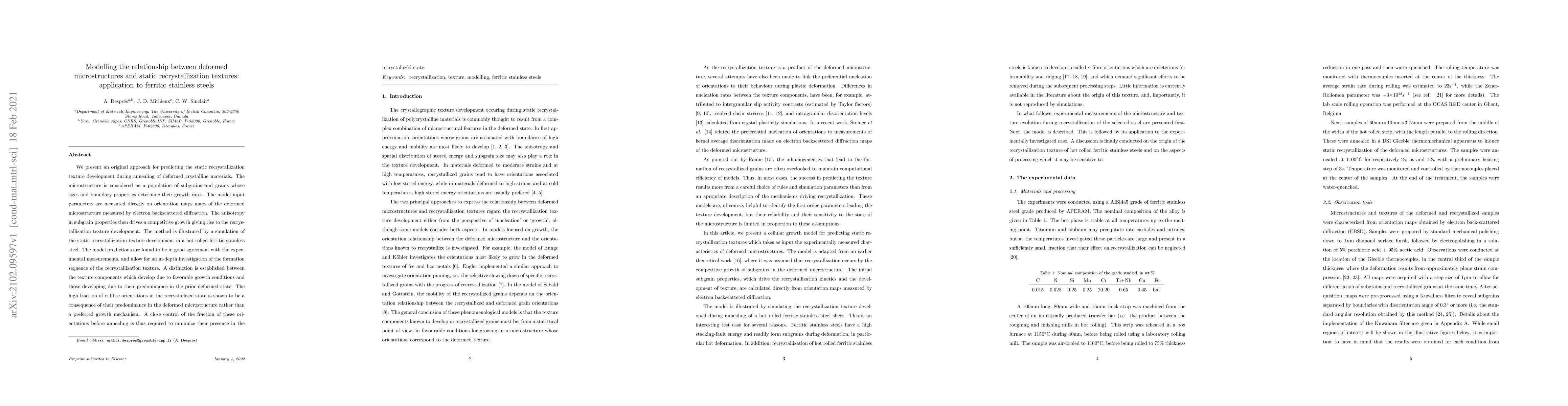 We present an original approach for predicting the static recrystallization texture development during annealing of deformed crystalline materials. The microstructure is considered as a population of subgrains and grains whose sizes and boundary properties determine their growth rates. The model input parameters are measured directly on orientation maps maps of the deformed microstructure measured by electron backscattered diffraction. The anisotropy in subgrain properties then drives a competitive growth giving rise to the recrystallization texture development. The method is illustrated by a simulation of the static recrystallization texture development in a hot rolled ferritic stainless steel. The model predictions are found to be in good agreement with the experimental measurements, and allow for an in-depth investigation of the formation sequence of the recrystallization texture. A distinction is established between the texture components which develop due to favorable growth conditions and those developing due to their predominance in the prior deformed state. The high fraction of alpha fibre orientations in the recrystallized state is shown to be a consequence of their predominance in the deformed microstructure rather than a preferred growth mechanism. A close control of the fraction of these orientations before annealing is thus required to minimize their presence in the recrystallized state.