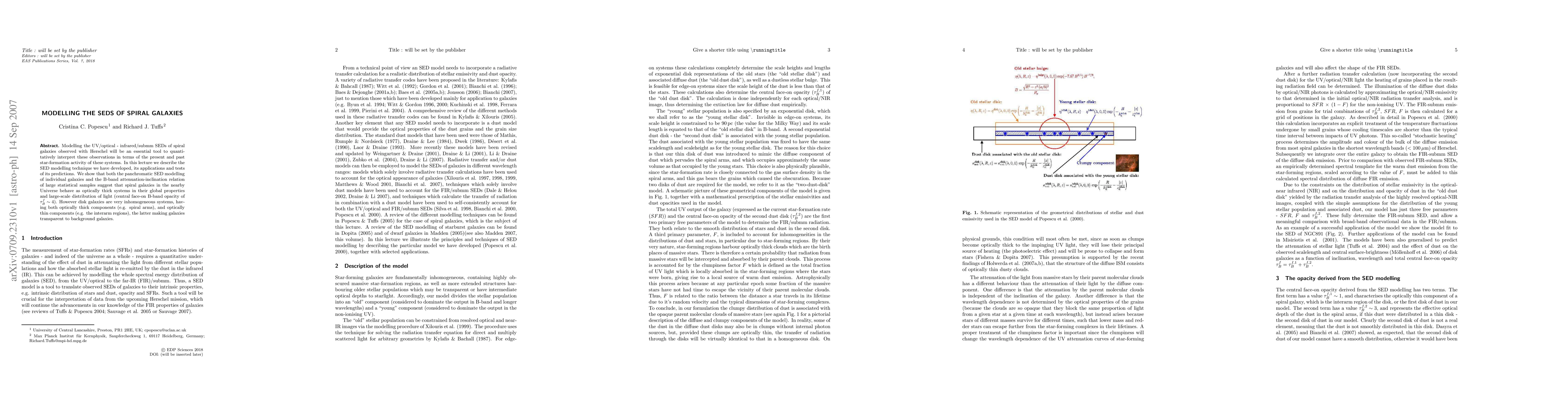 Modelling the UV/optical - infrared/submm SEDs of spiral galaxies observed with Herschel will be an essential tool to quantitatively interpret these observations in terms of the present and past star-formation activity of these systems. In this lecture we describe the SED modelling technique we have developed, its applications and tests of its predictions. We show that both the panchromatic SED modelling of individual galaxies and the B-band attenuation-inclination relation of large statistical samples suggest that spiral galaxies in the nearby Universe behave as optically thick systems in their global properties and large-scale distribution of light (central face-on B-band opacity of approx. 4). However disk galaxies are very inhomogeneous systems, having both optically thick components (e.g. spiral arms), and optically thin components (e.g. the interarm regions), the latter making galaxies transparent to background galaxies.