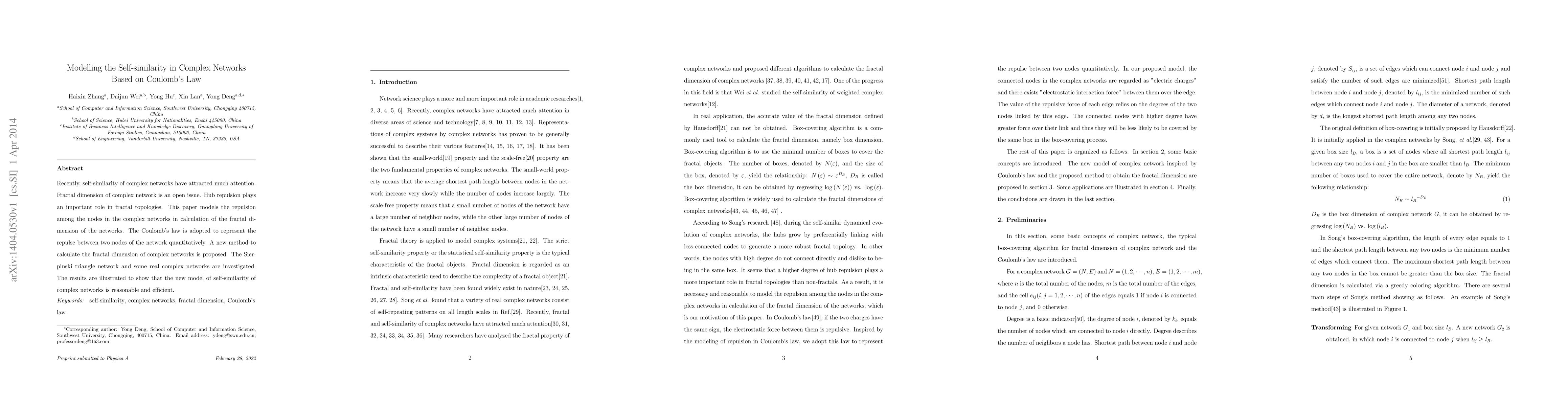 This paper proposes a novel method to model self-similarity in complex networks using Coulomb's law to quantify node repulsion, leading to a new calculation of fractal dimension. The approach is demonstrated on the Sierpinski triangle network and real complex networks, showing its reasonableness and efficiency.