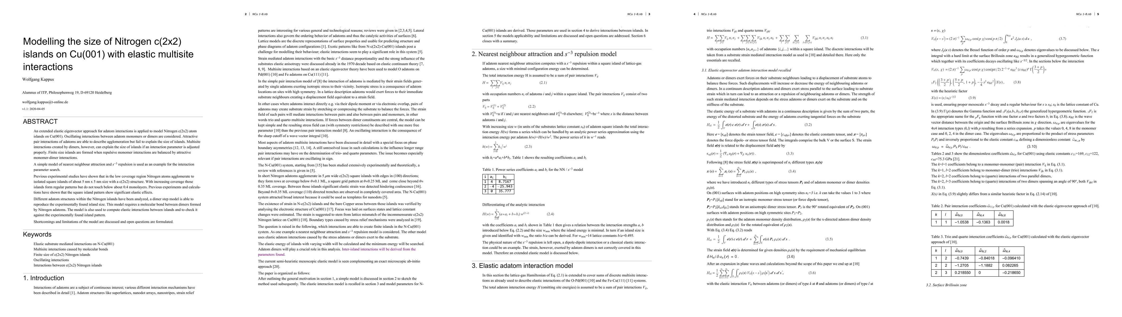 An extended elastic eigenvector approach for adatom interactions is applied to model Nitrogen c(2x2) Atom islands on Cu(001). Oscillating interactions between adatom monomers or dimers are considered. Attractive pair interactions of adatoms are able to describe agglomeration but fail to explain the size of islands. Multisite interactions created by dimers, however, can explain the size of islands if an interaction parameter is adjusted properly. Finite size islands are formed when repulsive monomer interactions are balanced by attractive monomer-dimer interactions. A simple model of nearest neighbour attraction and s-3 repulsion is used as an example for the interaction parameter search. Previous experimental studies have shown that in the low coverage region Nitrogen atoms agglomerate to isolated square islands of about 5 nm x 5 nm size with a c(2x2) structure. With increasing coverage those islands form regular patterns but do not touch below about 0.4 monolayers. Previous experiments and calculations have shown that the square island pattern show significant elastic effects. Different adatom structures within the Nitrogen islands have been analyzed, a dimer step model is able to reproduce the experimentally found island size. This model requires a molecular bond between dimers formed by Nitrogen adatoms. The model is also used to compute elastic interactions between islands and to check it against the experimentally found island pattern. Shortcomings and limitations of the model are discussed and open questions are formulated.