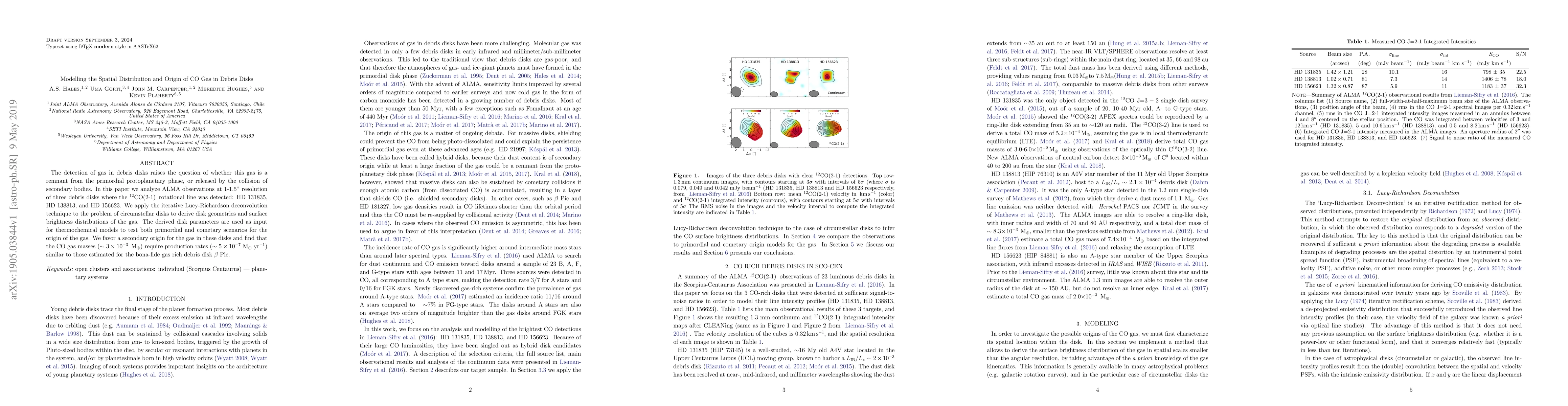 The detection of gas in debris disks raises the question of whether this gas is a remnant from the primordial protoplanetary phase, or released by the collision of secondary bodies. In this paper we analyze ALMA observations at 1-1.5" resolution of three debris disks where the $^{12}$CO(2-1) rotational line was detected: HD131835, HD138813, and HD156623. We apply the iterative Lucy-Richardson deconvolution technique to the problem of circumstellar disks to derive disk geometries and surface brightness distributions of the gas. The derived disk parameters are used as input for thermochemical models to test both primordial and cometary scenarios for the origin of the gas. We favor a secondary origin for the gas in these disks and find that the CO gas masses ($\sim 3\times10^{-3}$ M$_{\oplus}$) require production rates ($\sim 5\times 10^{-7}$ M$_{\oplus}$~yr$^{-1}$) similar to those estimated for the bona-fide gas rich debris disk $\beta$ Pic.