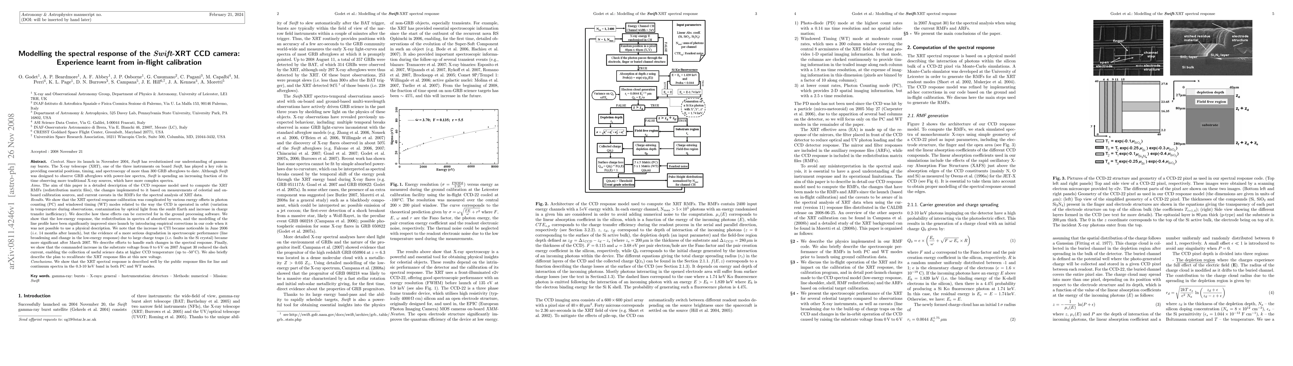 This paper discusses the calibration challenges of the Swift-XRT CCD camera, highlighting energy offsets in photon counting and timing modes due to temperature variations, optical light, and charge transfer inefficiency. It outlines improvements in low-energy response and spectral redistribution through empirical corrections, and notes significant performance degradation post-2007 due to charge traps. The increase in substrate voltage in August 2007 reduced dark current, allowing data collection at higher temperatures.