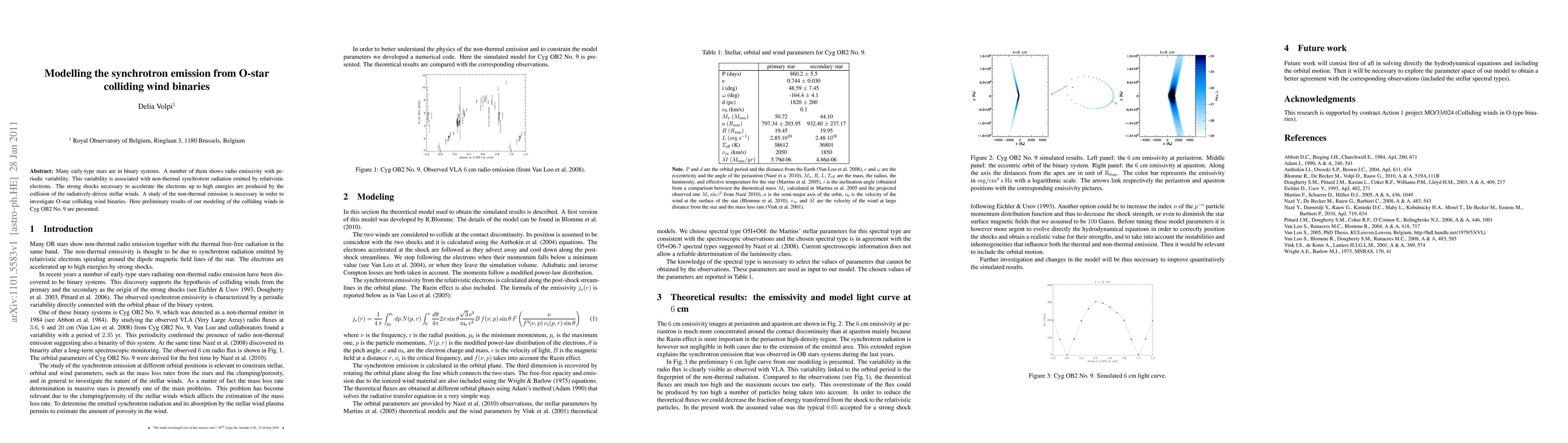 This paper models the synchrotron emission from O-star colliding wind binaries, focusing on the non-thermal radio emissivity in Cyg OB2 No.9. The study aims to understand the relativistic electron acceleration via stellar wind collisions and presents preliminary results from the modeling.
