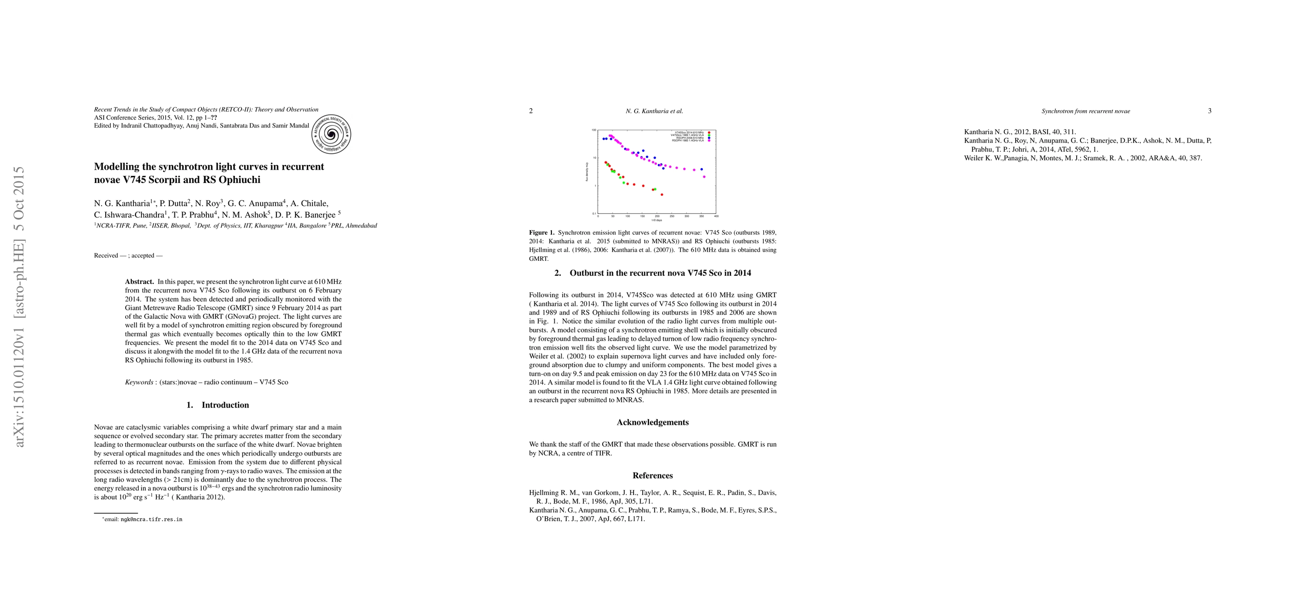 This paper models the synchrotron light curves at 610 MHz for recurrent nova V745 Sco post-outburst in 2014, using GMRT observations, and compares it to the 1.4 GHz data of RS Ophiuchi post-outburst in 1985, both fitting well to a synchrotron emission model with thermal gas obscuration.