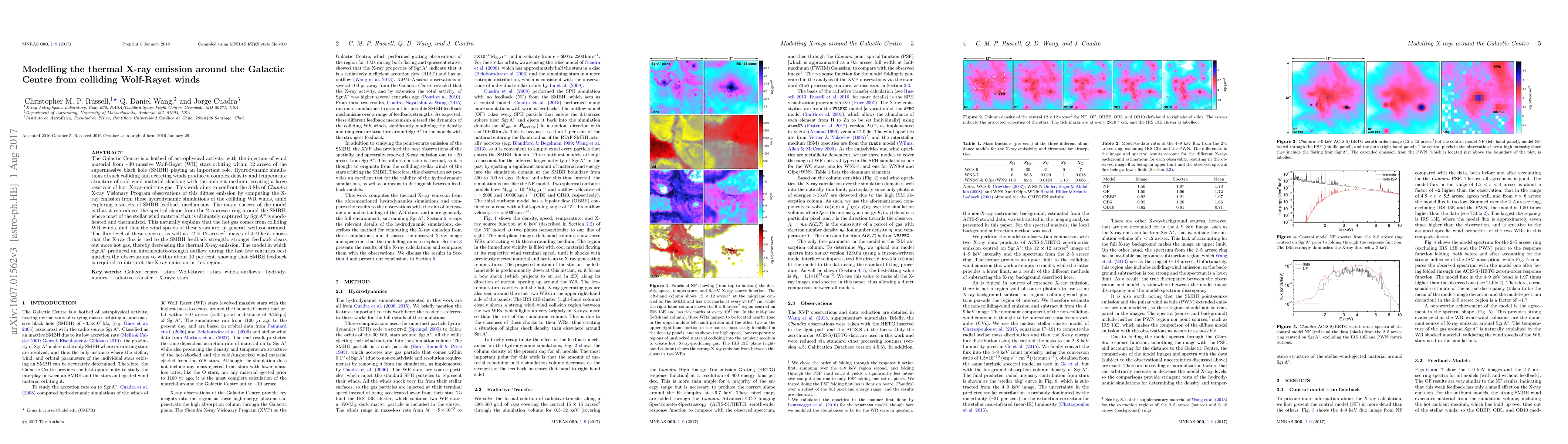 This research models the thermal X-ray emission from colliding Wolf-Rayet winds around the Galactic Centre, showing that hydrodynamic simulations of these winds reproduce the spectral shape of observed X-ray emissions. The model indicates that SMBH feedback is crucial, with stronger feedback decreasing thermal X-ray emission by clearing out hot gas.