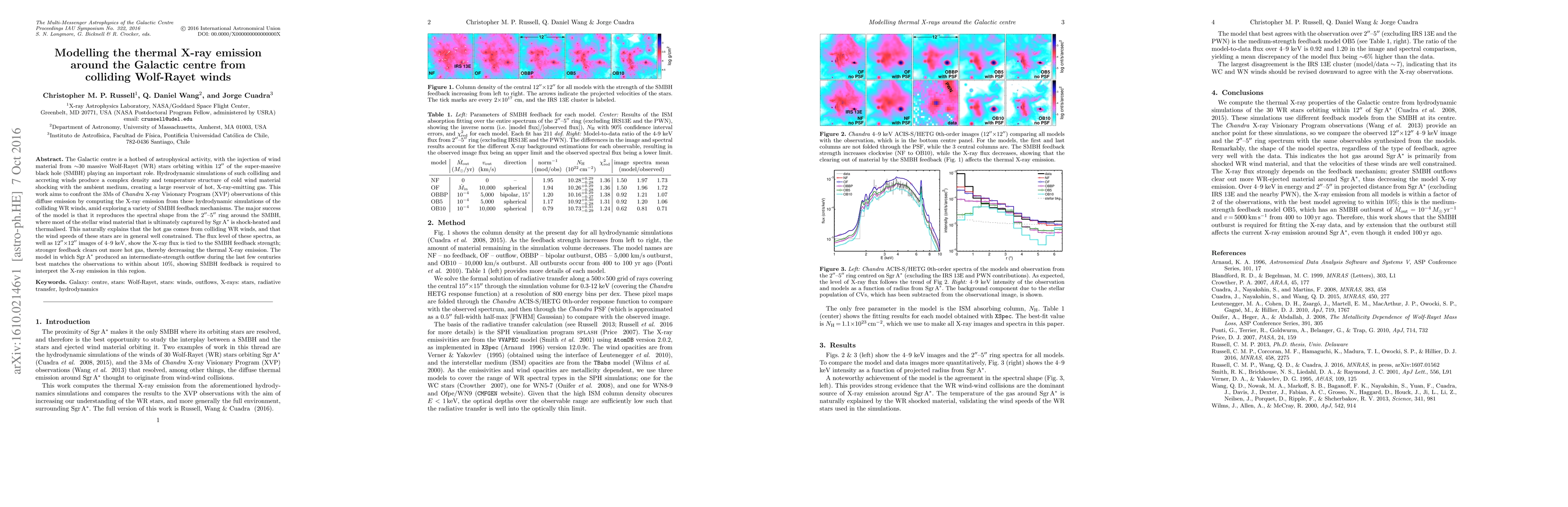 This paper models the thermal X-ray emission around the Galactic centre from colliding Wolf-Rayet winds, showing that hydrodynamic simulations of these winds reproduce the observed spectral shape and flux levels. The model indicates that SMBH feedback is crucial in explaining the X-ray emission, with stronger feedback decreasing the thermal X-ray flux.